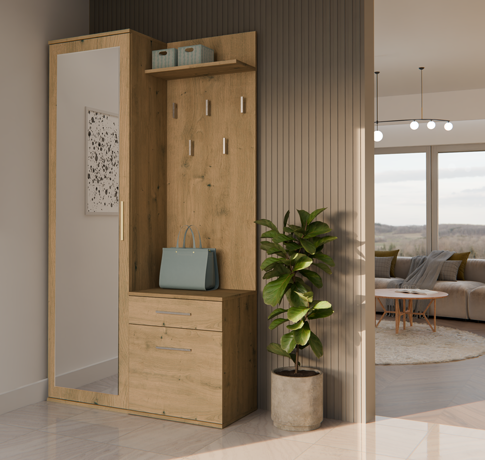 Předsíňová sestava DUO je ideální volbou pro ty, kteří chtějí mít doma krásný a praktický nábytek. Sestava zahrnuje prostornou skříň s velkým zrcadlem, věšák s policí a menší skříňku se šuplíkem, vše v elegantním odstínu dřeva Artisan. Moderní design uspokojí každého, kdo ocení spojení jednoduchosti a elegance. Skříň s lustrem nabízí dostatek úložného prostoru, menší skříňka a šuplík jsou praktické pro drobnosti a věci každodenní potřeby. Věšák je vybaven pěti háčky a policí. Jednotlivé části sestavy lze umístit těsně u sebe, nebo je volně rozestavit podle potřeby. Dveře skříně lze namontovat na levou či pravou stranu. Skříň s lustrem je rovněž dostupná k zakoupení samostatně.
