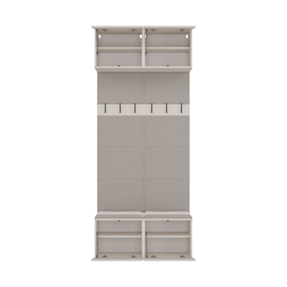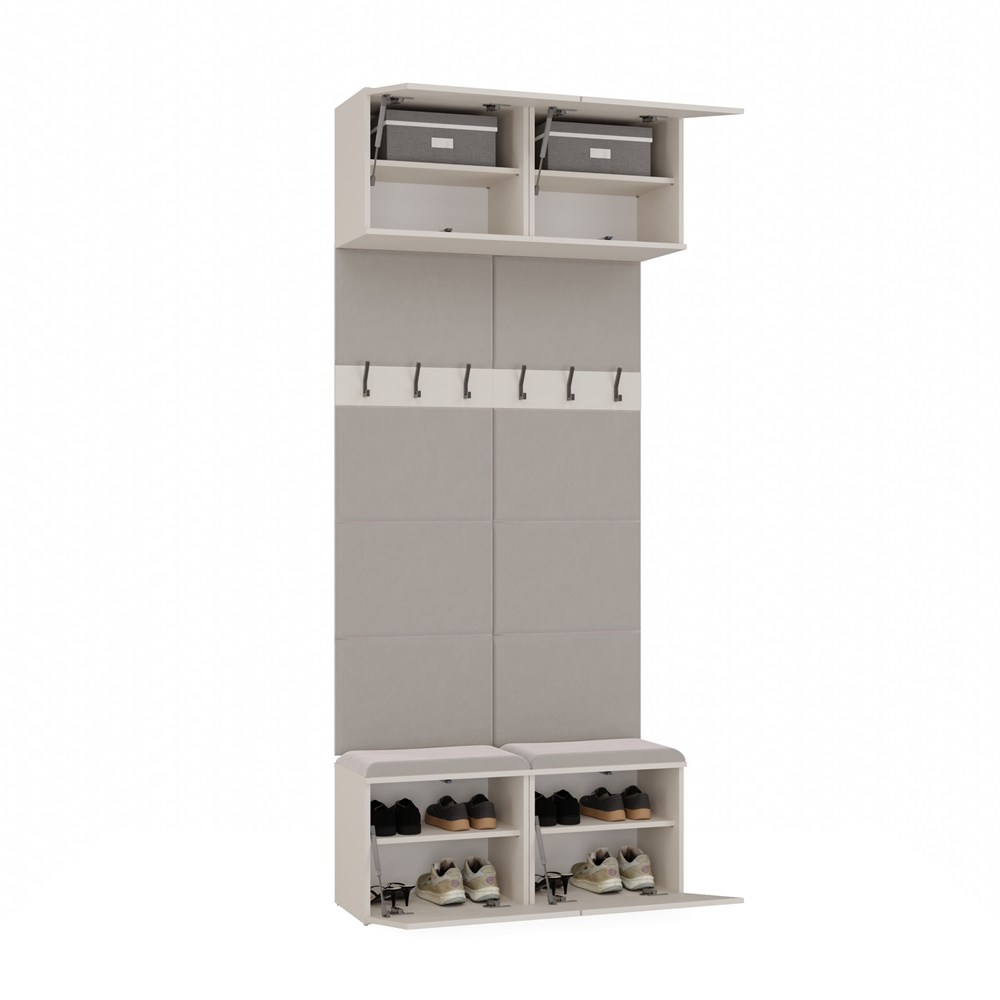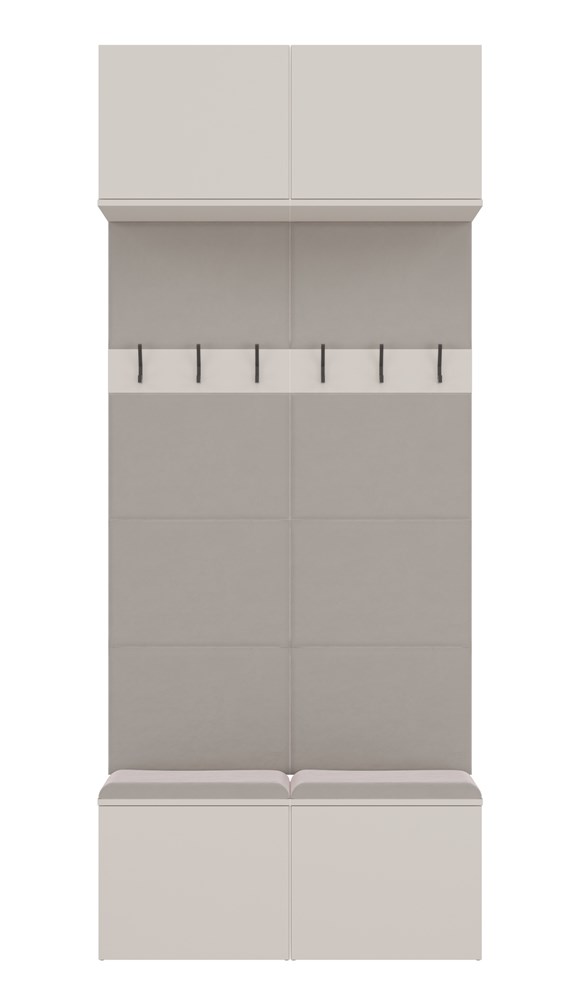 Místo klasické vestavěné skříně je tento model vybaven otevřenými věšáky s háčky, které umožňují rychlý přístup ke kabátům, taškám nebo batohům. Díky tomu je nábytek vhodný jak do malých interiérů, tak i do prostorných hal, kde je důležitá funkčnost a vizuální lehkost.
