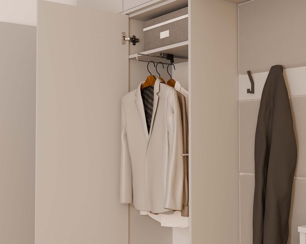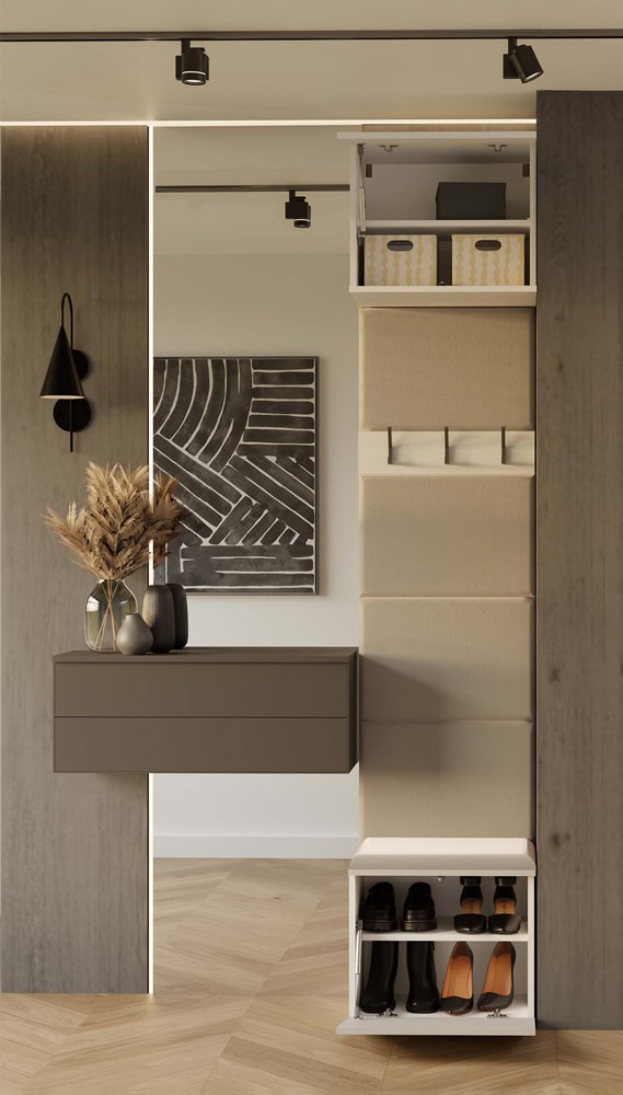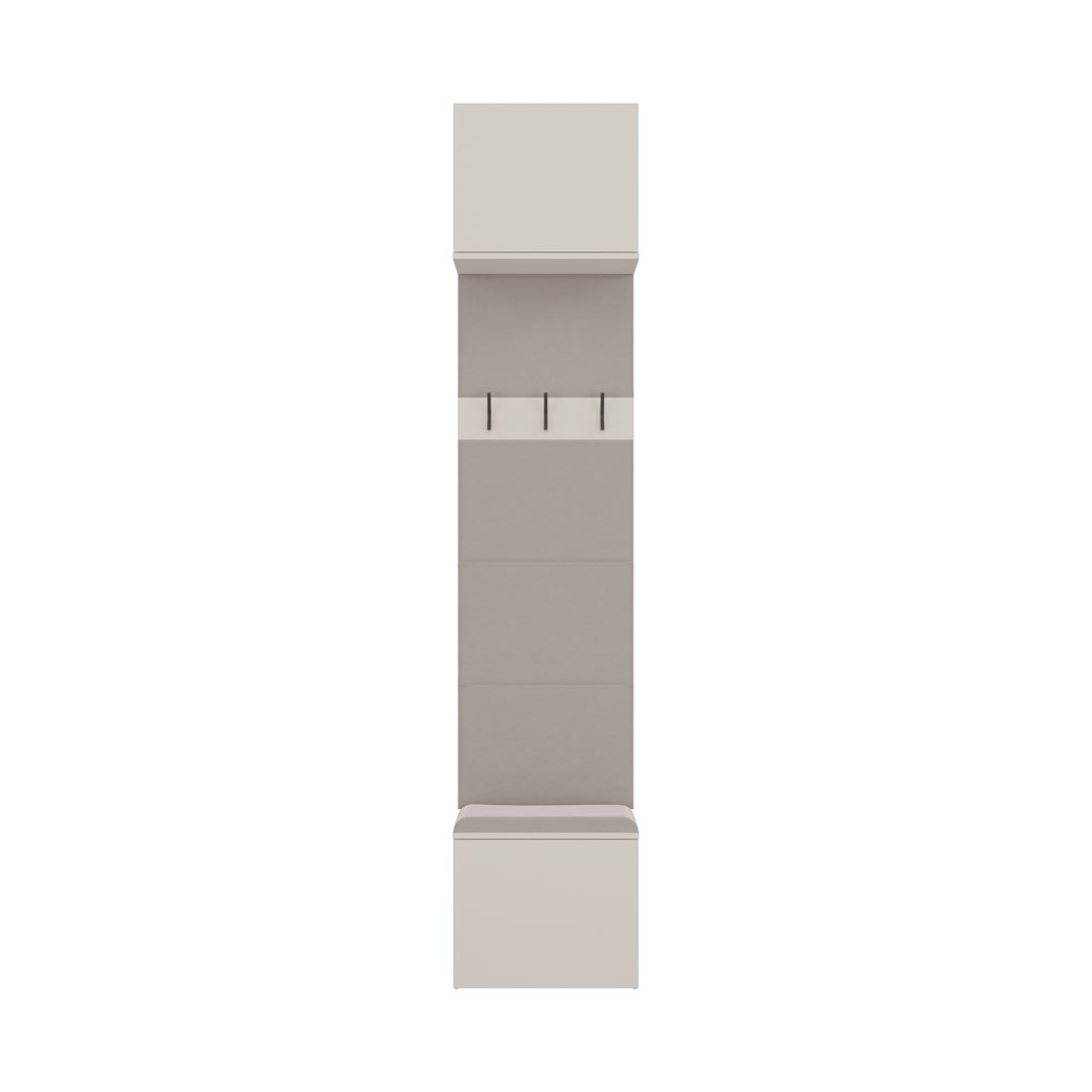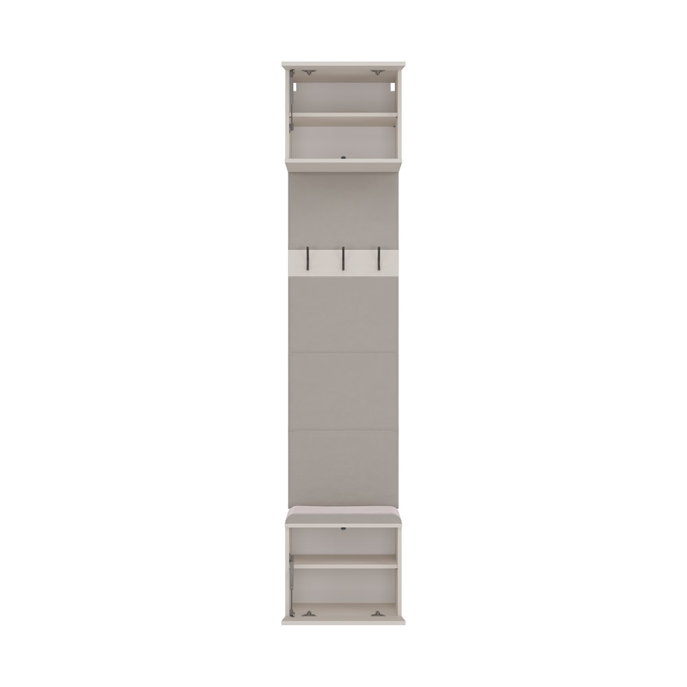 Namísto klasické uzavřené šatní skříně je model vybaven otevřeným věšákem s háčky, který umožňuje rychlý přístup k bundám, taškám nebo batohům. Díky tomu se nábytek skvěle hodí jak do menších předsíní, tak i do prostorných vstupních hal, kde je důležitá funkčnost a optická lehkost.