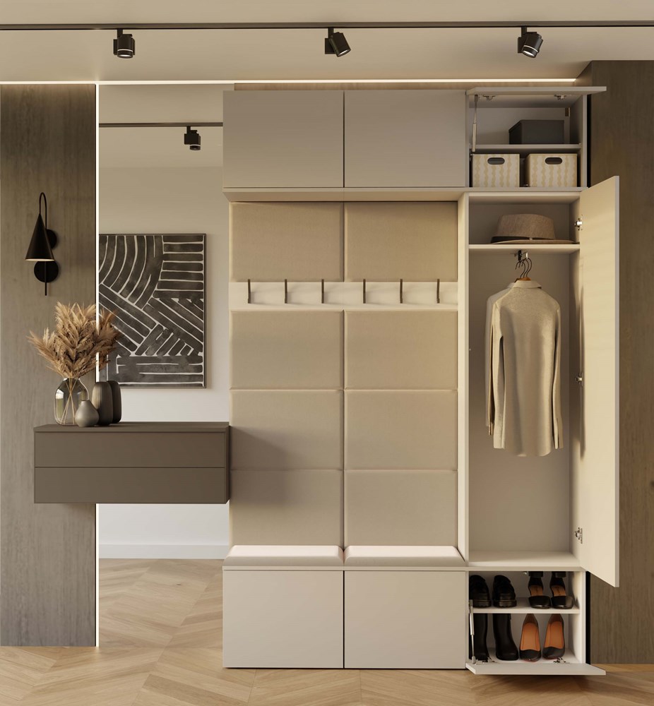Horní skříňka s policí rozdělující prostor na dvě zóny: horní 20,3 cm, dolní 16,8 cm – ideální pro čepice, šály, tašky nebo boxy.