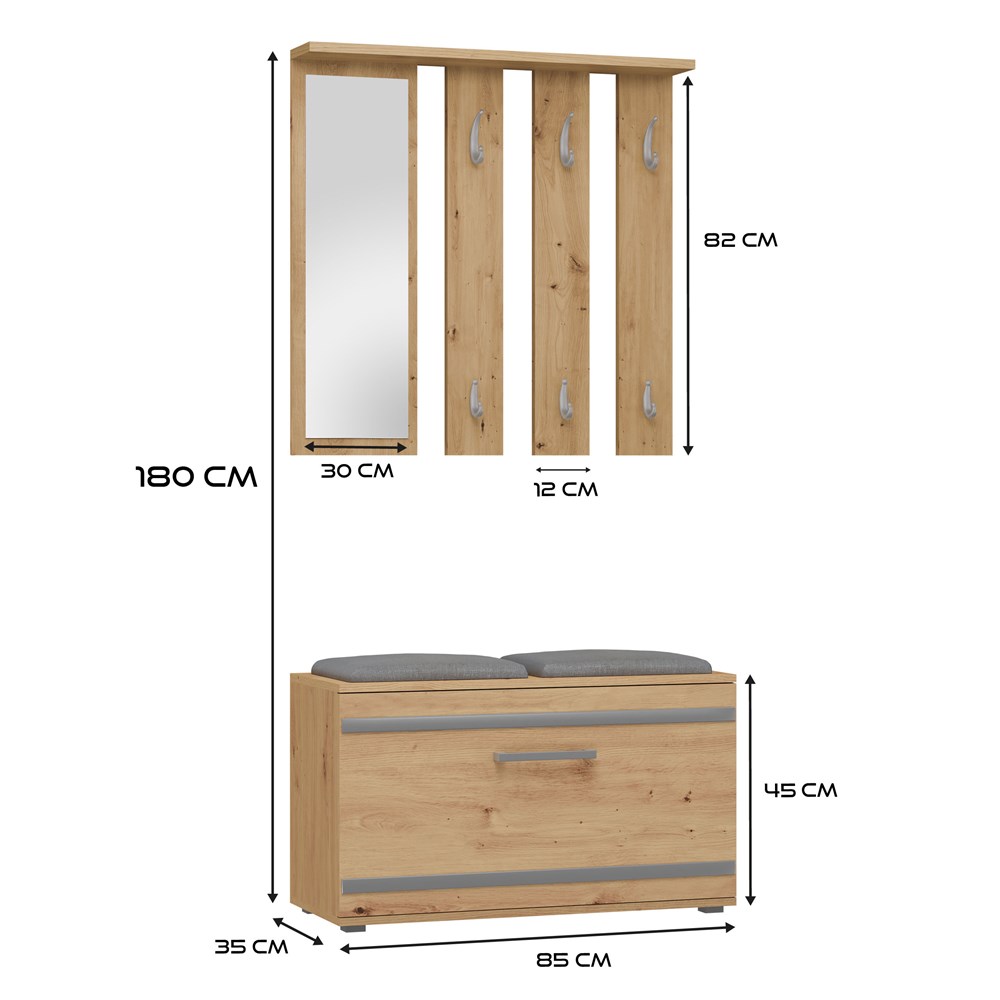 Naše předsíňová sestava zajistí, že vaše předsíň bude funkční a pohodlná. Sestava obsahuje šest věšáků na oděvy, praktickou poličku a velké zrcadlo, přičemž výšku věšáků si můžete nastavit podle potřeby. Pohodlné úchyty umožňují snadné otevírání dveří skříňky, která pojme 8–9 párů bot, a sedák poskytuje komfortní místo k sezení. Nábytek je pečlivě zpracovaný a vyznačuje se vysokou kvalitou.