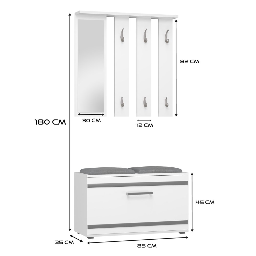 Naše předsíňová sestava zajistí, že vaše předsíň bude funkční a pohodlná. Sestava obsahuje šest věšáků na oděvy, praktickou poličku a velké zrcadlo, přičemž výšku věšáků si můžete nastavit podle potřeby. Pohodlné úchyty umožňují snadné otevírání dveří skříňky, která pojme 8–9 párů bot, a sedák poskytuje komfortní místo k sezení. Celý nábytek je pečlivě zpracovaný a vyznačuje se vysokou kvalitou.