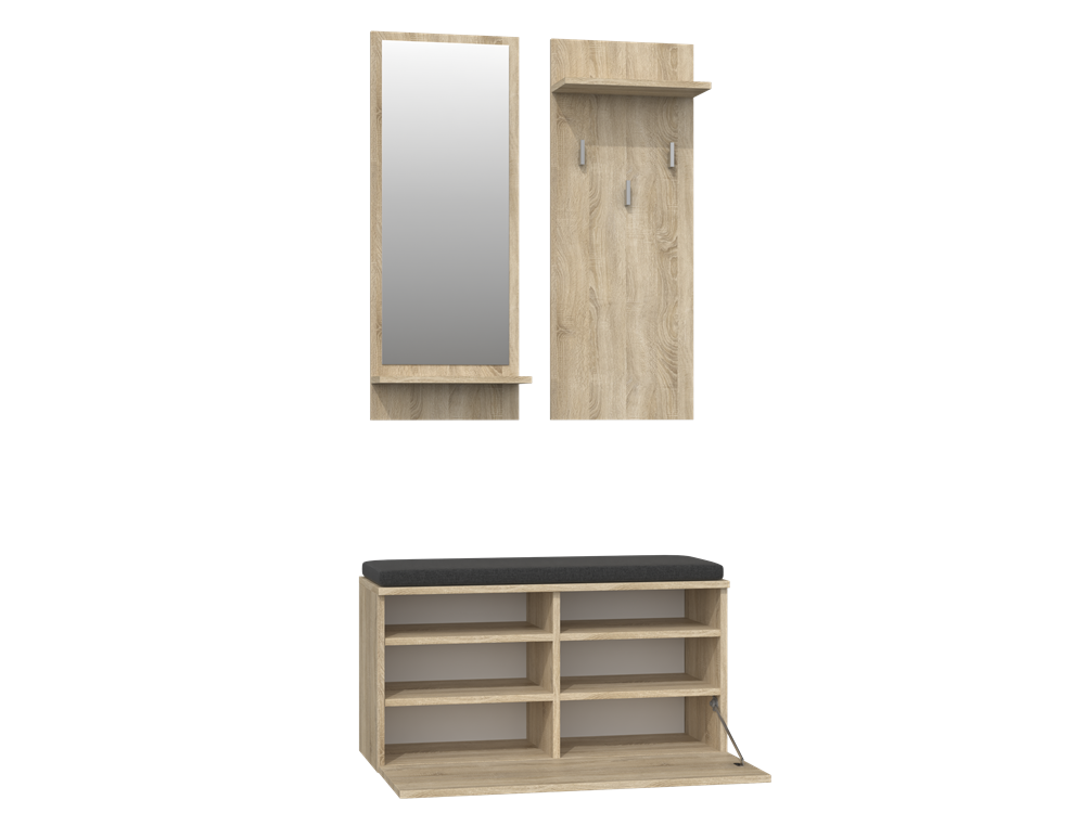 Předsíňová sestava RIVA je ideální volbou pro ty, kteří ocení krásný a praktický nábytek ve svém interiéru. Moderní design splňuje očekávání všech, kdo mají rádi spojení jednoduchosti a elegance. Sestava zahrnuje zrcadlo s policí, věšák s policí a botník se sedátkem a praktickým úložným prostorem. Botník je vyroben z laminované dřevotřískové desky o tloušťce 16 mm, která je odolná proti oděru, a viditelné hrany jsou opatřeny ABS hranou. Součástí sestavy je botníková skříňka se sedátkem a úložným prostorem, šest polic, praktické zrcadlo s policí a tři věšáky.