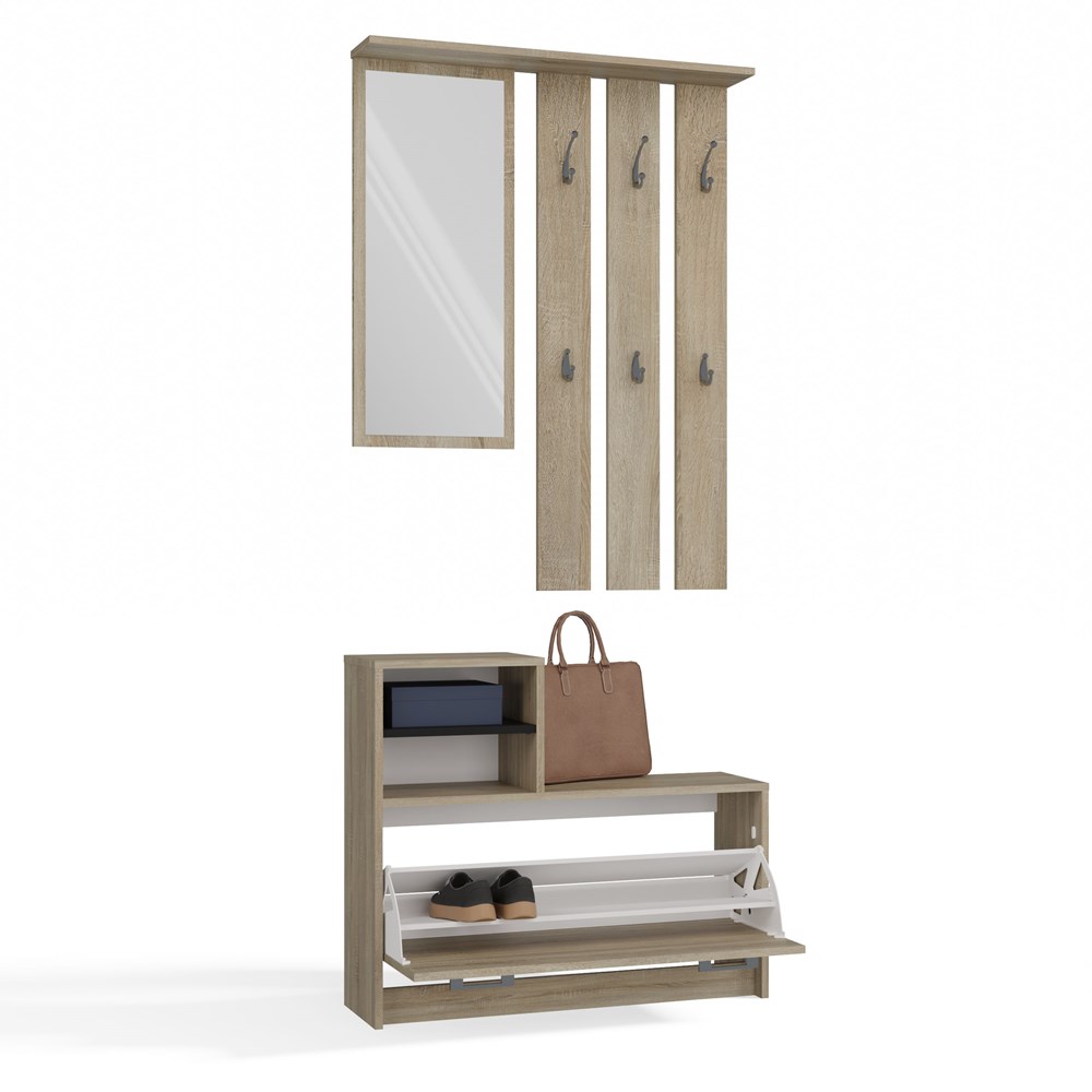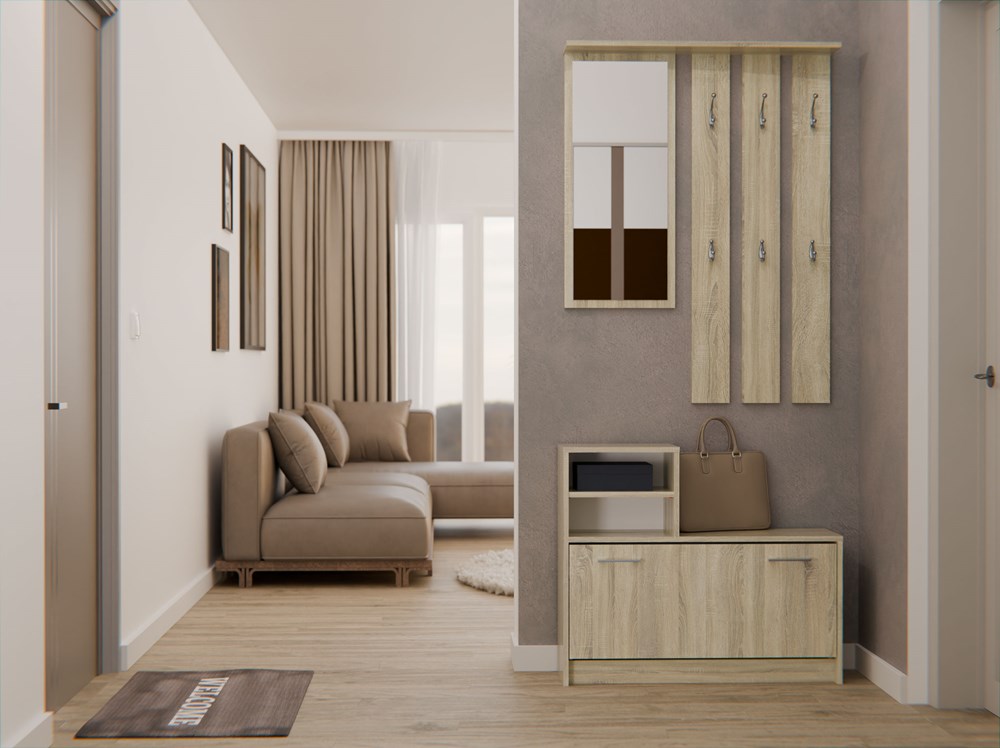 Praktická předsíňová sestava, která kombinuje věšák se zrcadlem a botník, zajistí funkční a pohodlné uspořádání vaší předsíně. Nabízí dostatek místa pro oblečení i obuv a pomáhá udržet pořádek hned u vstupu do domova.