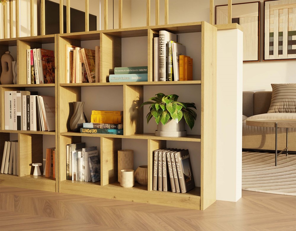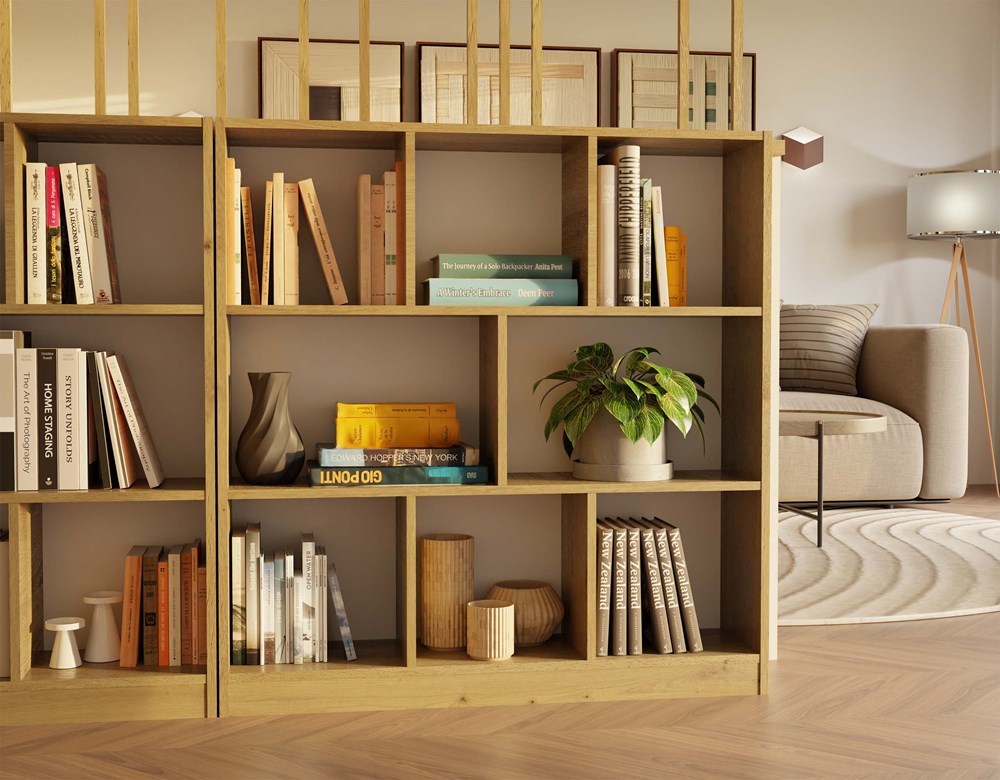 Regál Fiesta 8P je moderní a minimalistický nábytek, který se skvěle hodí do interiérů ve skandinávském stylu. Jeho jednoduchá otevřená konstrukce zajišťuje pohodlné ukládání a zároveň umožňuje esteticky vystavit knihy, dekorace nebo doplňky. Díky kompaktním rozměrům se regál uplatní v obývacím pokoji, ložnici, dětském pokoji i domácí kanceláři. Regál disponuje 8 prostornými přihrádkami, které usnadňují organizaci a umožňují stylově vystavit oblíbené předměty. Přírodní odstín Dub Artisan dodává nábytku teplé a elegantní provedení, které ladí s různými styly interiérů.