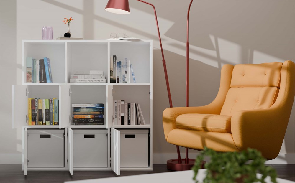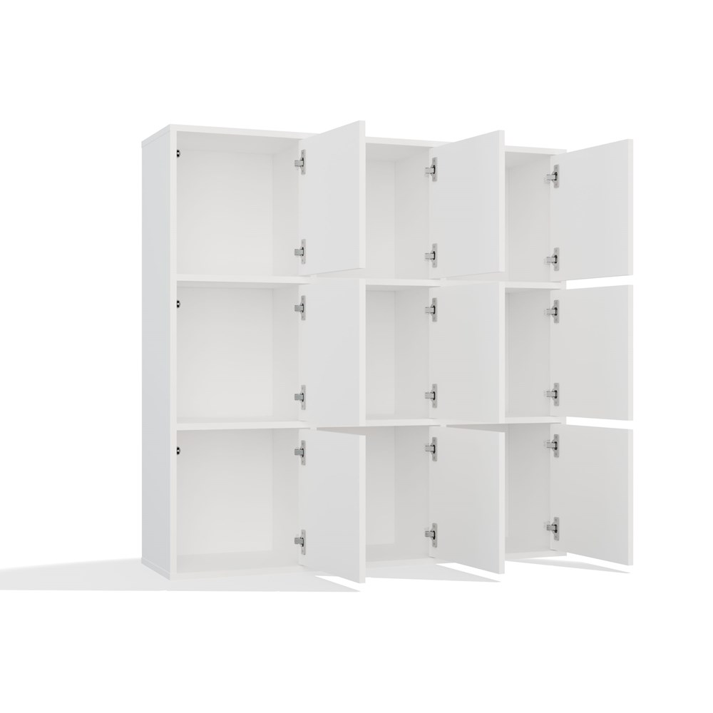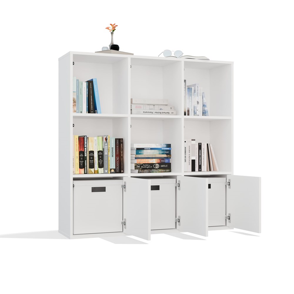 Regál nabízí 9 stejně velkých přihrádek vhodných pro knihy, boxy, dokumenty, hračky nebo dekorace. Součástí jsou 3 plná dvířka se systémem TIP-ON, která lze namontovat do libovolně zvolených komor. Minimalistické provedení v matné bílé barvě umožňuje snadné kombinování s dalšími kusy nábytku. Stabilní konstrukce z laminované desky o tloušťce 16 mm je odolná při každodenním používání.