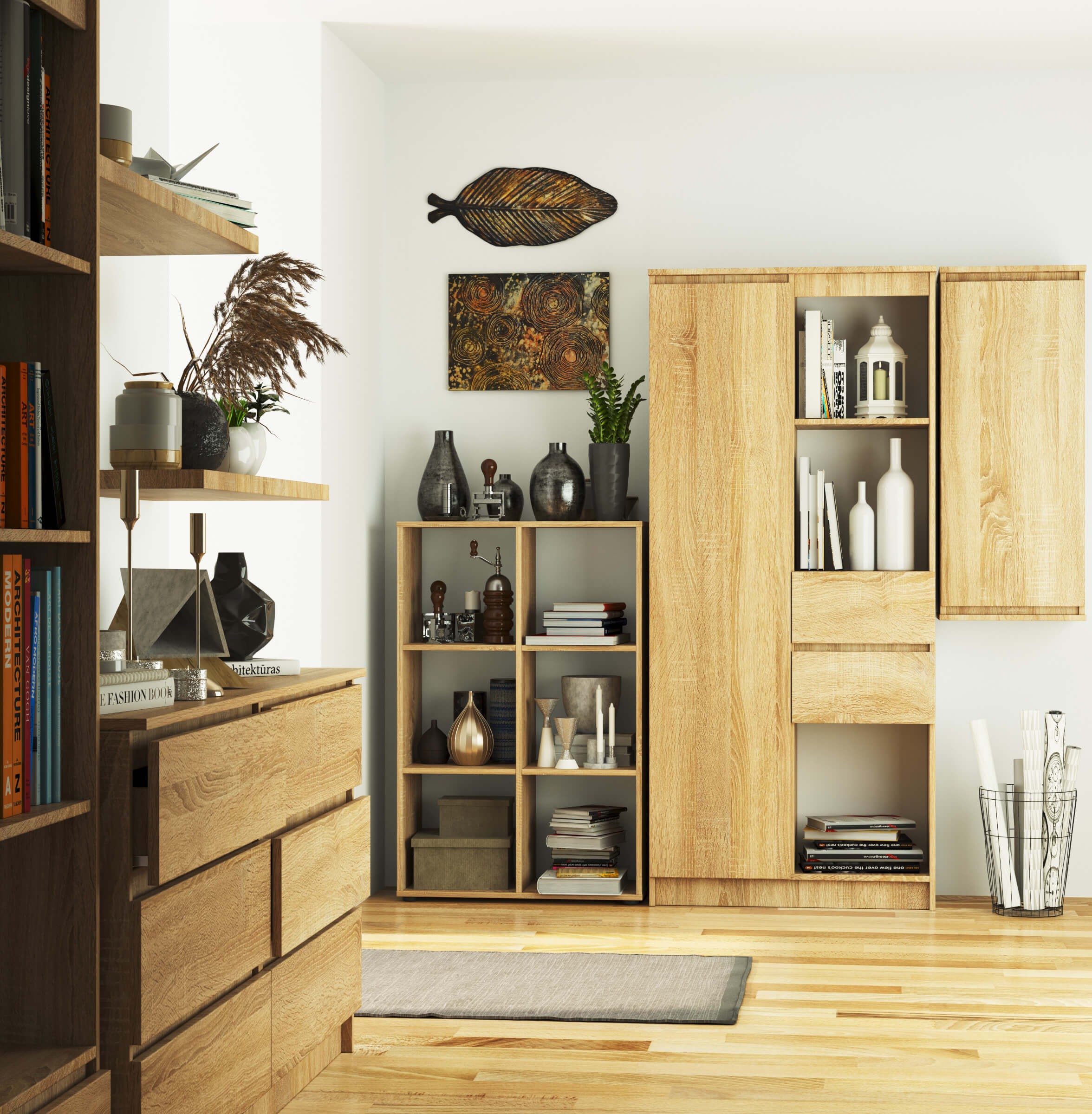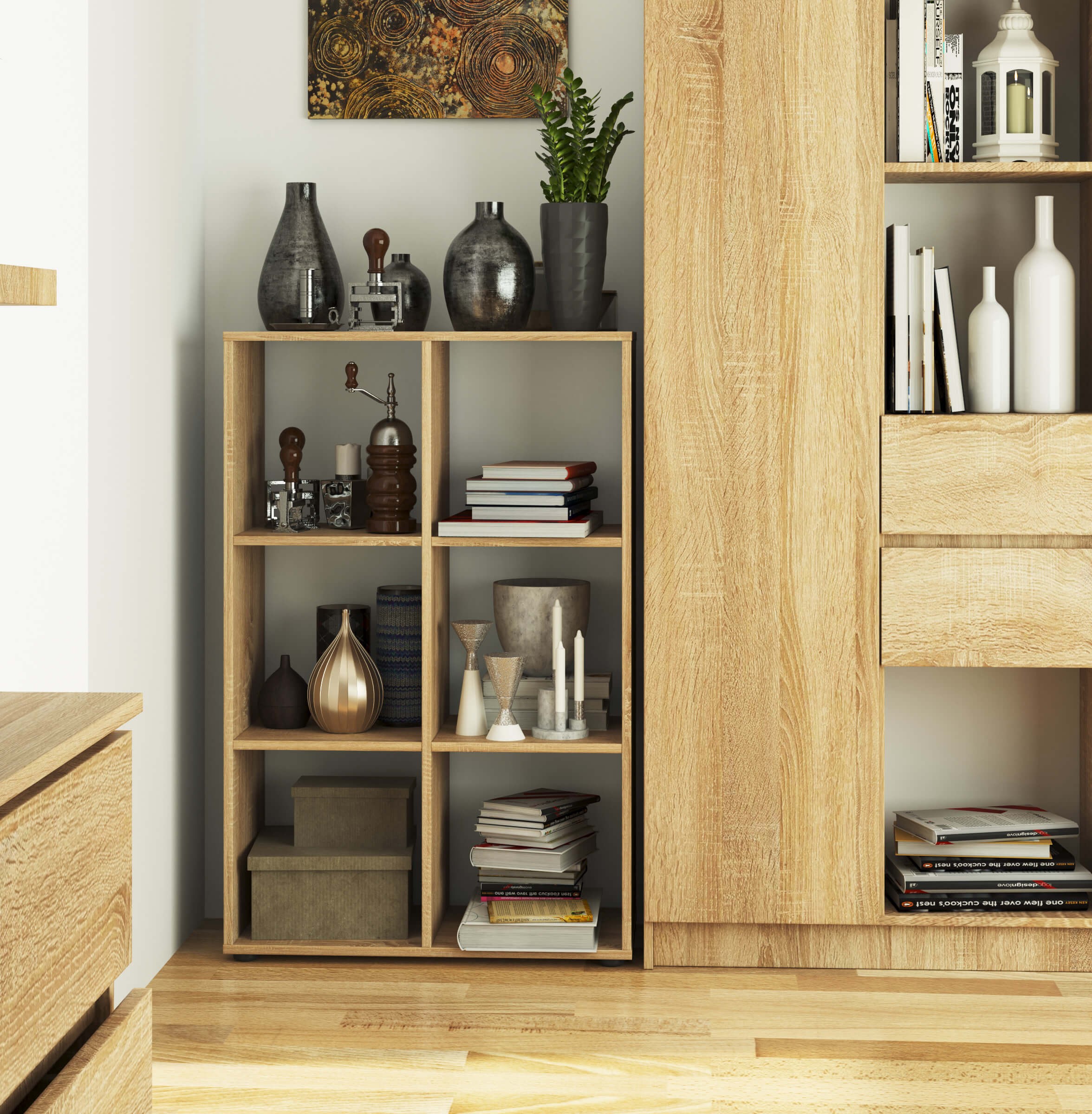 Regál Quad se šesti policemi v dekoru dub sonoma je praktický a moderní kus nábytku, který se hodí do obývacího pokoje, pracovny, kanceláře i dětského pokoje. Díky přírodnímu dekoru dřeva působí útulně a zároveň elegantně.
