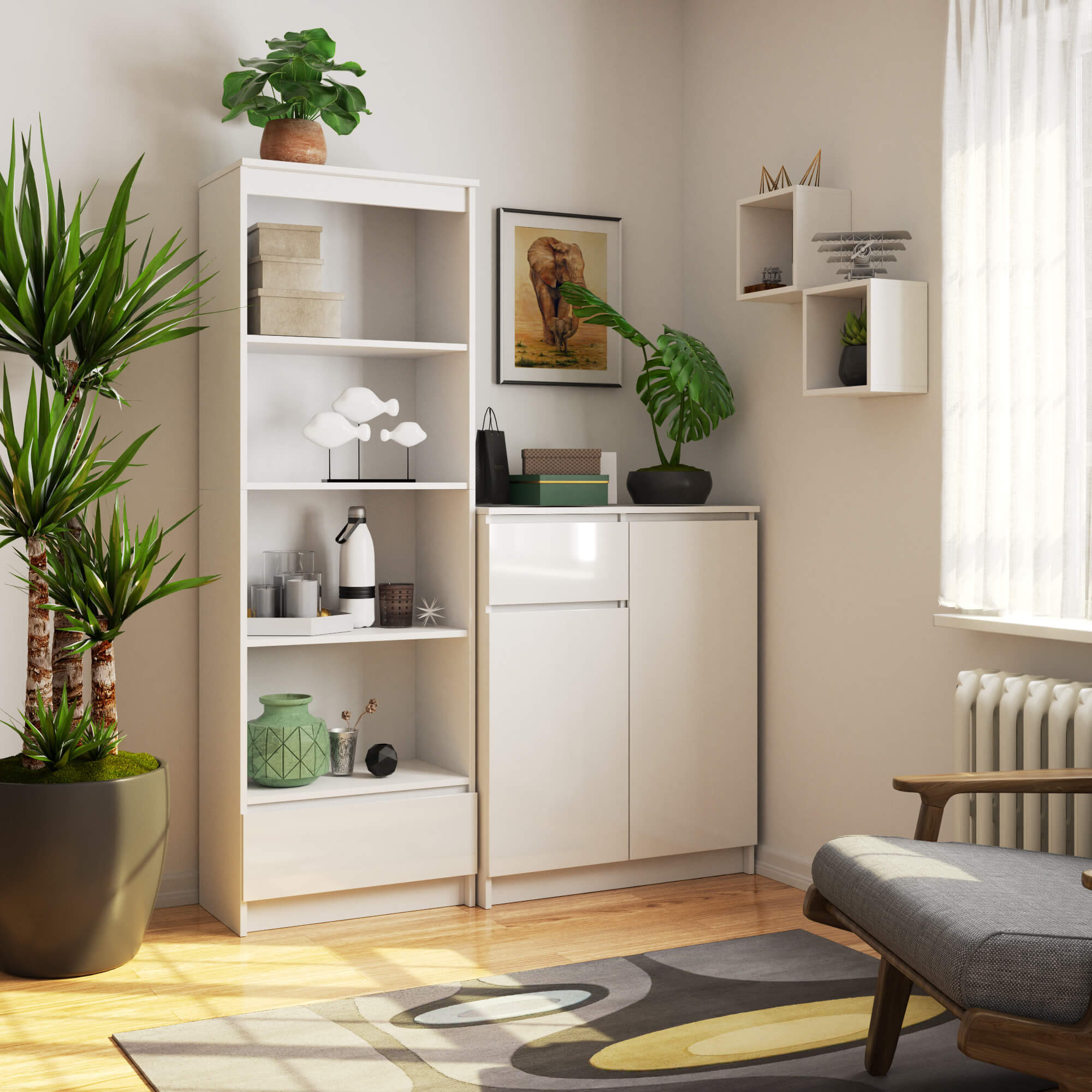 Bílý kancelářský regál R60 se čtyřmi policemi a jednou zásuvkou je funkčním a elegantním kusem nábytku, který se skvěle hodí do kanceláří, domácích pracoven i moderně zařízených obytných prostor. Jednoduchý design v bílé barvě působí čistě, nadčasově a snadno se kombinuje s ostatním vybavením interiéru.