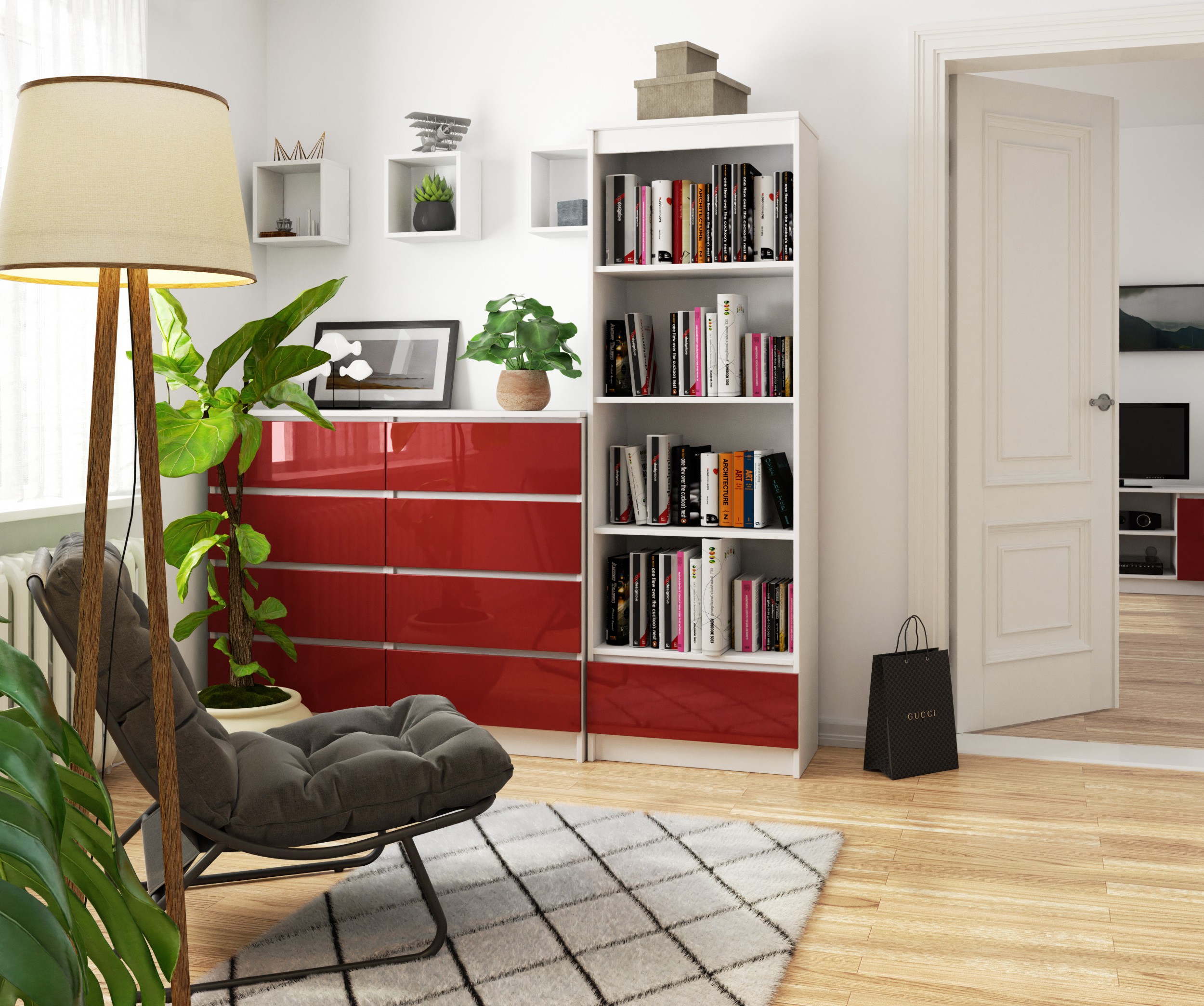 Kancelářský regál R60 s jednou zásuvkou a čtyřmi policemi je výrazným a zároveň praktickým kusem nábytku vhodným do kanceláře, domácí pracovny i moderního interiéru. Kombinace bílé konstrukce a lesklého červeného čela zásuvky vytváří atraktivní kontrast, který dodává regálu originální a dynamický vzhled.