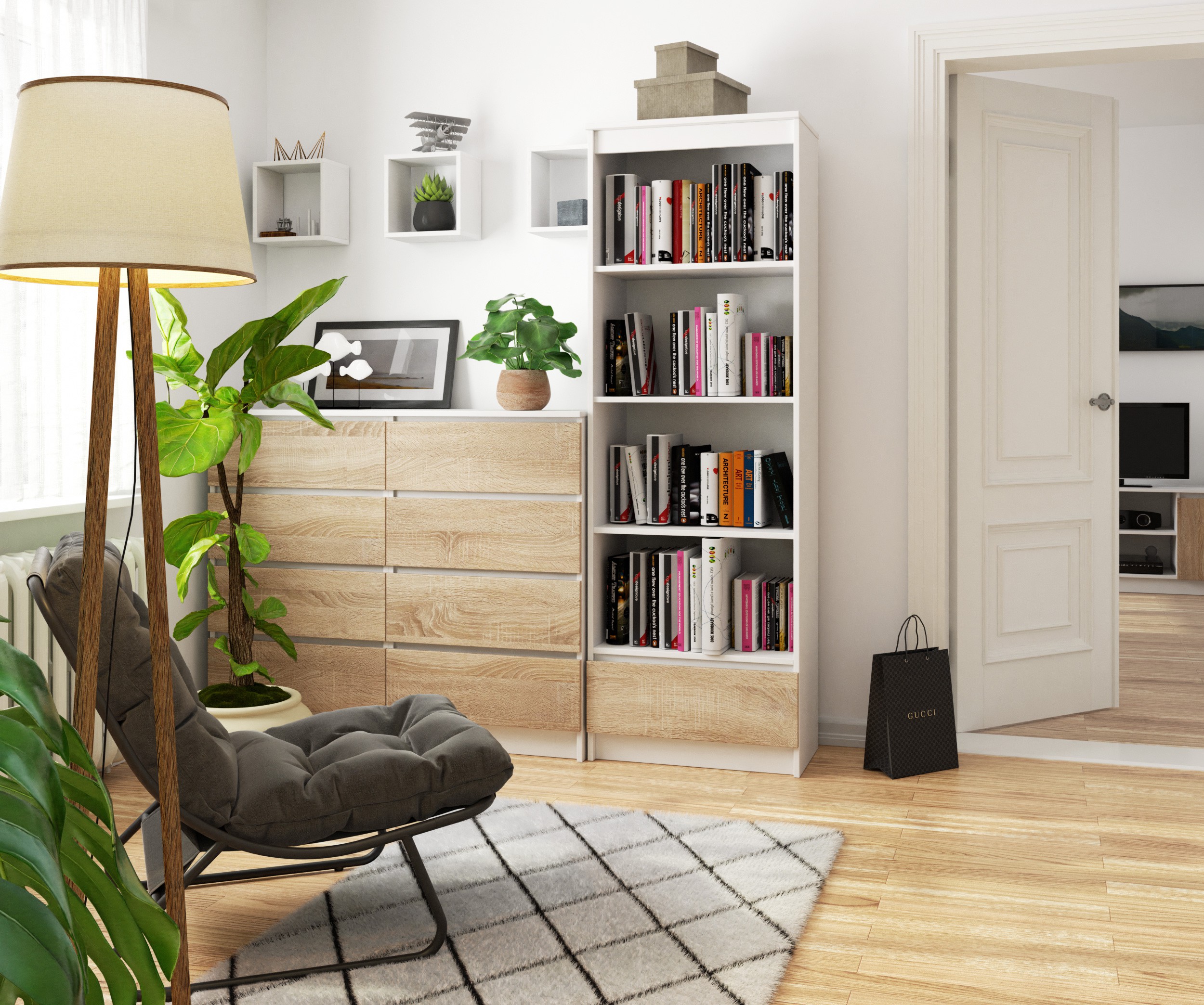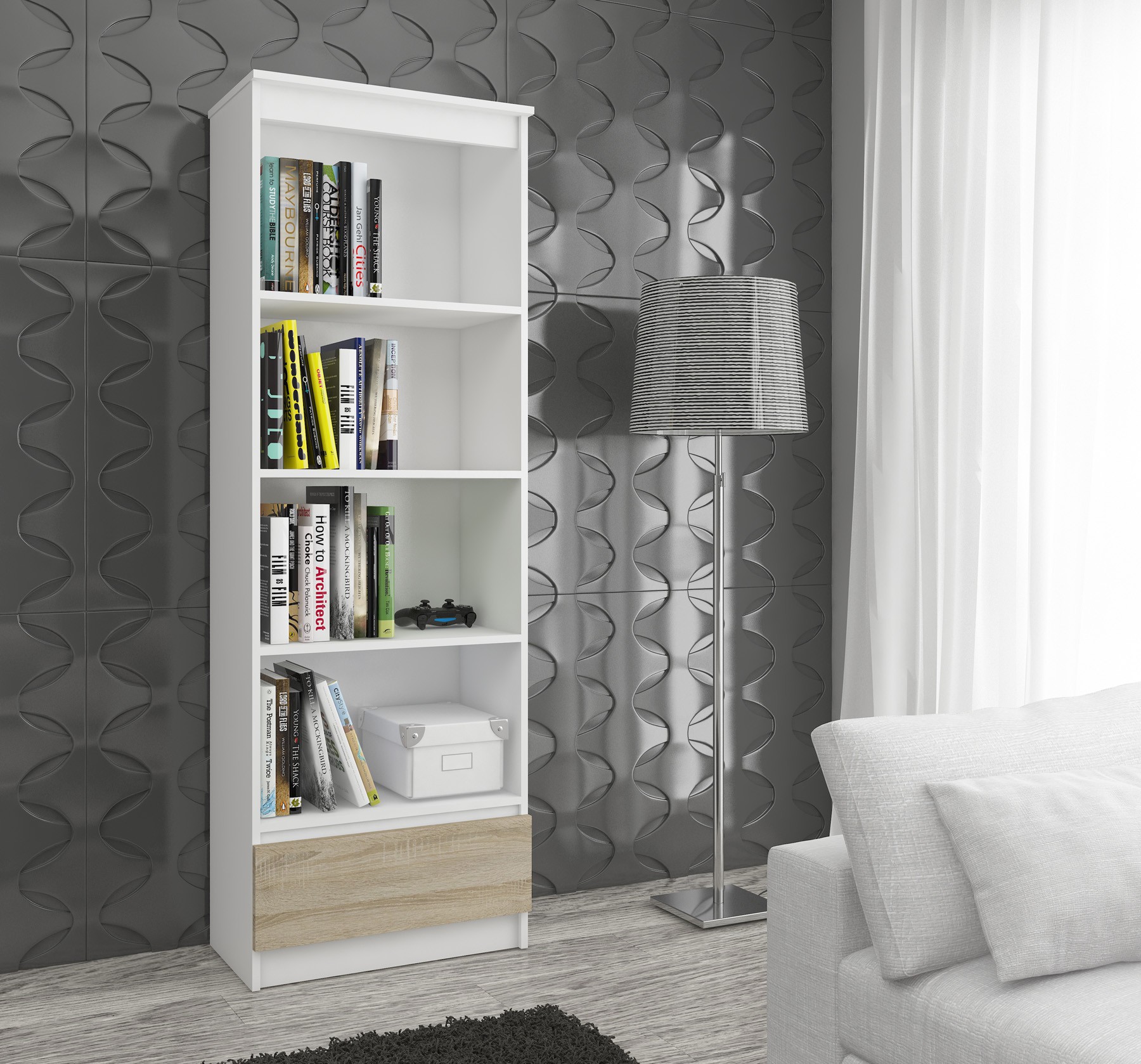 Regál je vyroben z kvalitní laminované desky, která je odolná proti oděru a vhodná pro každodenní používání. Hrany jsou opatřeny ABS hranou, která chrání povrch nábytku před poškozením a prodlužuje jeho životnost. Police lze montovat dle vlastních potřeb díky předvrtaným montážním otvorům.