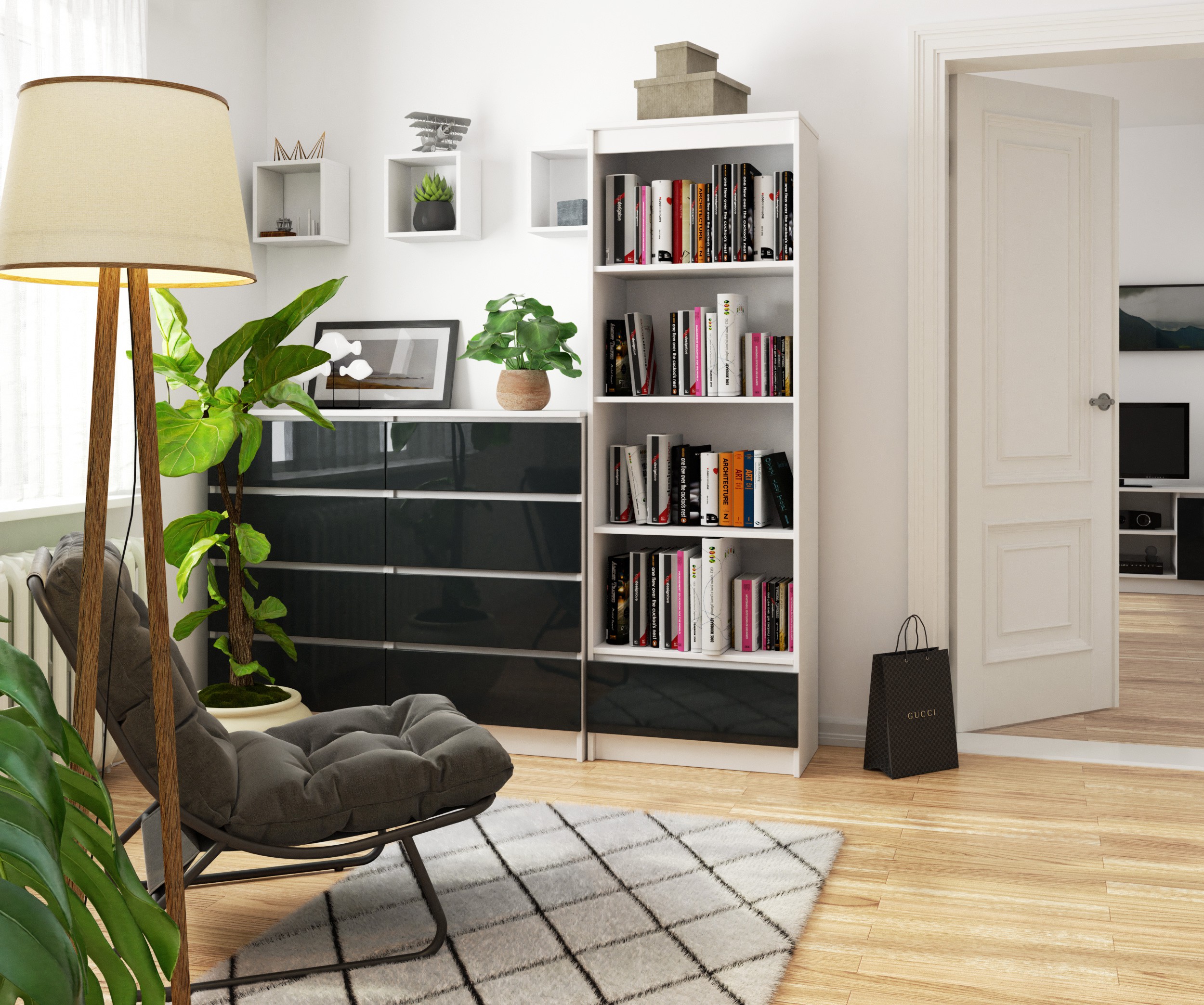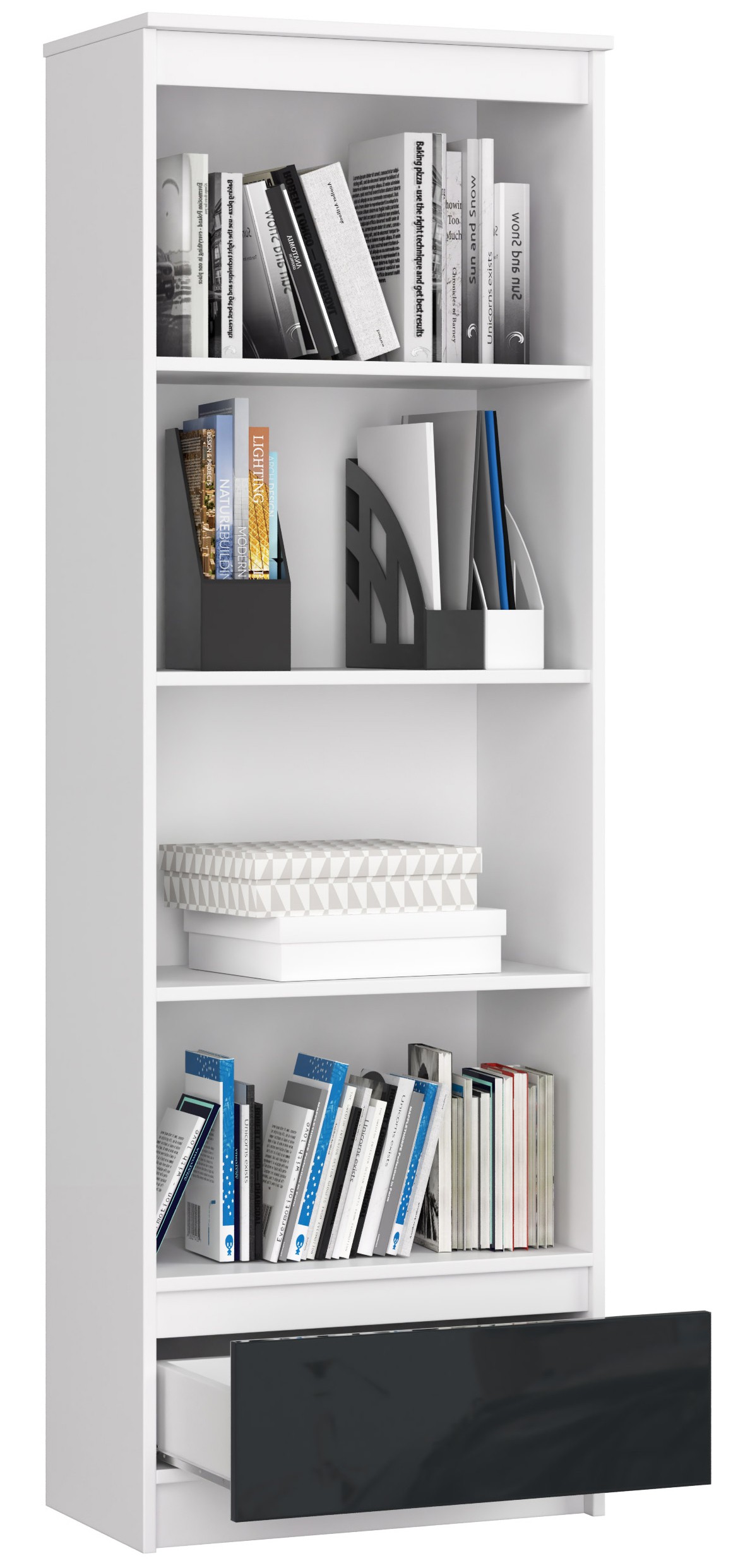 Kancelářský regál R60 s jednou zásuvkou a čtyřmi policemi je praktickým a univerzálním kusem nábytku vhodným do kanceláře, pracovny i domácího interiéru. Kombinace bílé konstrukce a grafitového lesklého čela zásuvky působí moderně a elegantně a snadno se sladí s různými styly zařízení.