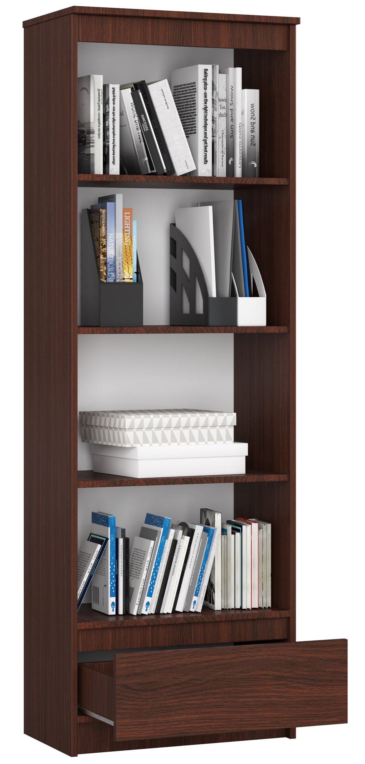 Úložný prostor tvoří čtyři prostorné police, jejichž výšku lze přizpůsobit podle potřeby díky třem montážním otvorům. Spodní část doplňuje praktická a objemná zásuvka na kovových rolničkových pojezdech s blokací výsuvu, ideální pro ukládání dokumentů, knih, kancelářských potřeb i osobních věcí. Regál lze využít nejen prakticky, ale i dekorativně – například pro vystavení knih, dekorací či sběratelských předmětů.