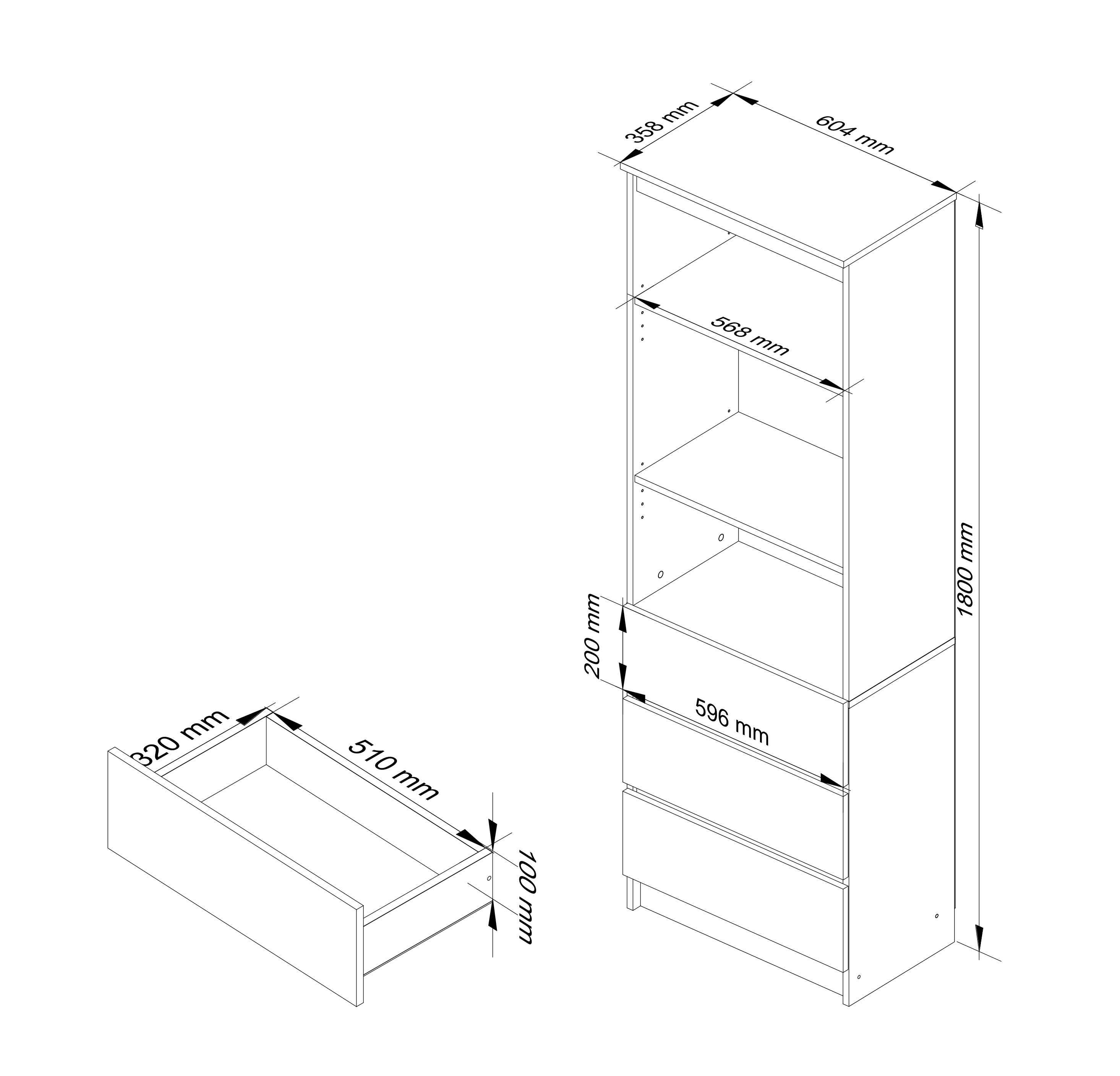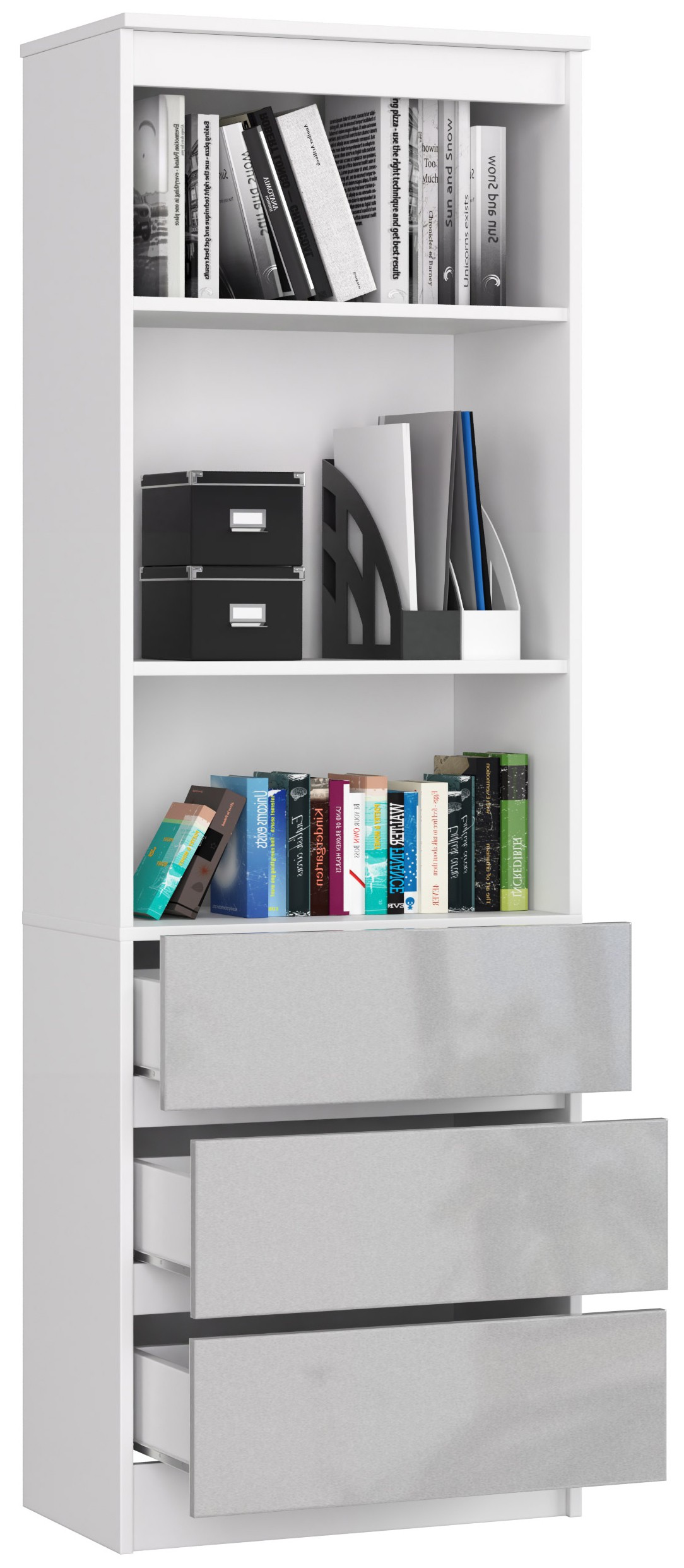 Horní část regálu tvoří dvě prostorné police s možností výškového nastavení ve třech úrovních díky připraveným montážním otvorům. Spodní část je vybavena třemi zásuvkami s pojezdy GTV a blokací výsuvu, které umožňují plynulé a bezpečné otevírání. Regál nabízí široké možnosti využití – police jsou ideální pro knihy, dekorace či dokumenty, zatímco zásuvky poslouží k uložení kancelářských potřeb, techniky nebo drobných doplňků.