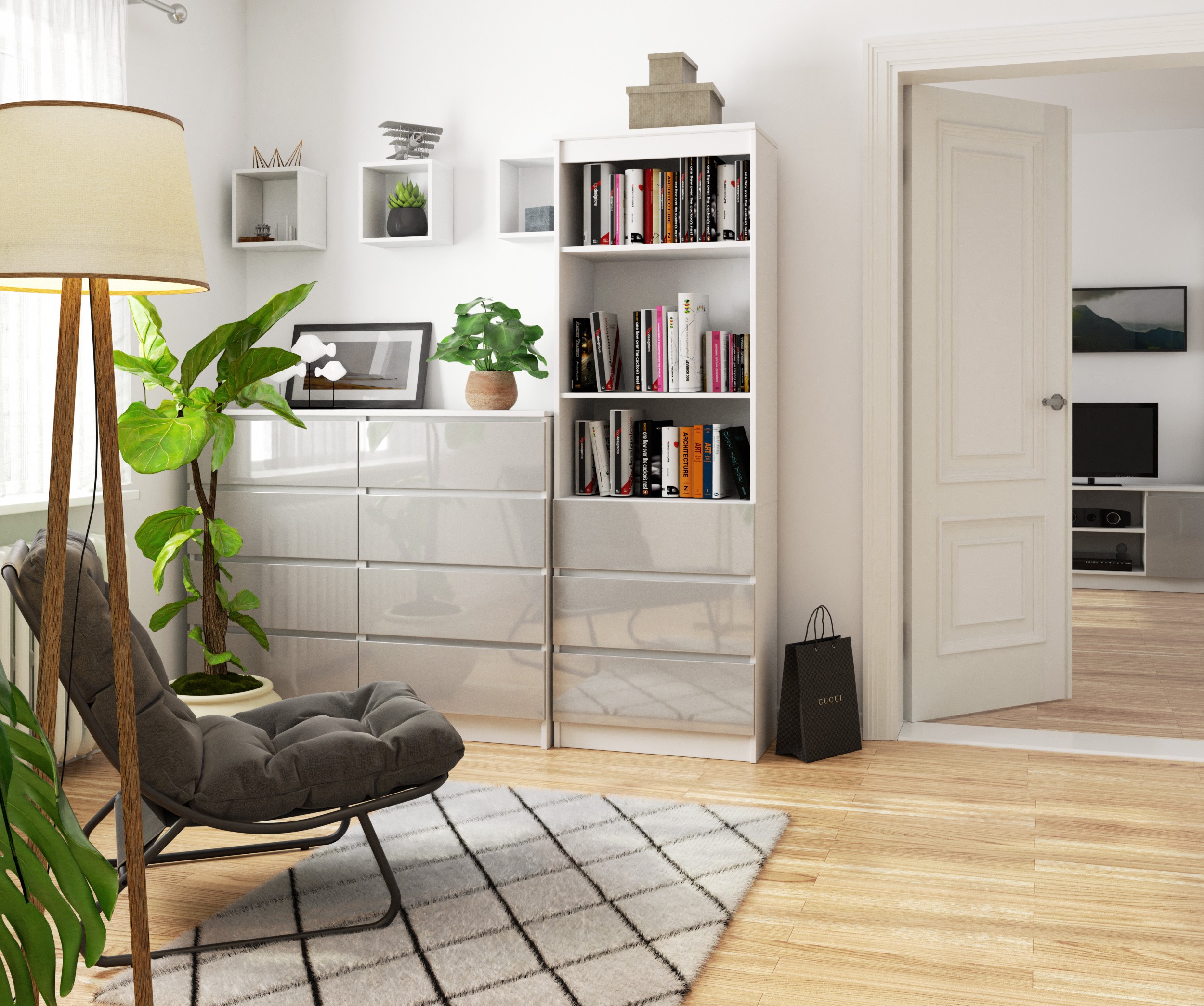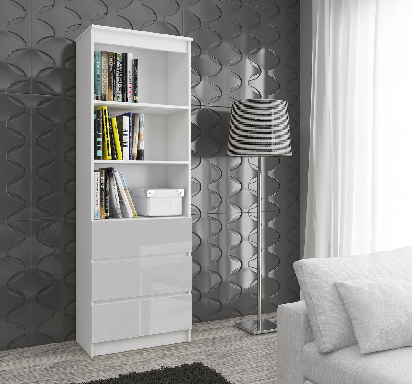 Kancelářský regál R60 v kombinaci bílé konstrukce a metalických čel ve vysokém lesku zaujme moderním designem a kvalitním zpracováním. Elegantní spojení bílé barvy s metalickým leskem působí svěže a nadčasově, díky čemuž se regál skvěle hodí do kanceláře, domácí pracovny, obývacího pokoje i pokoje pro mladé.