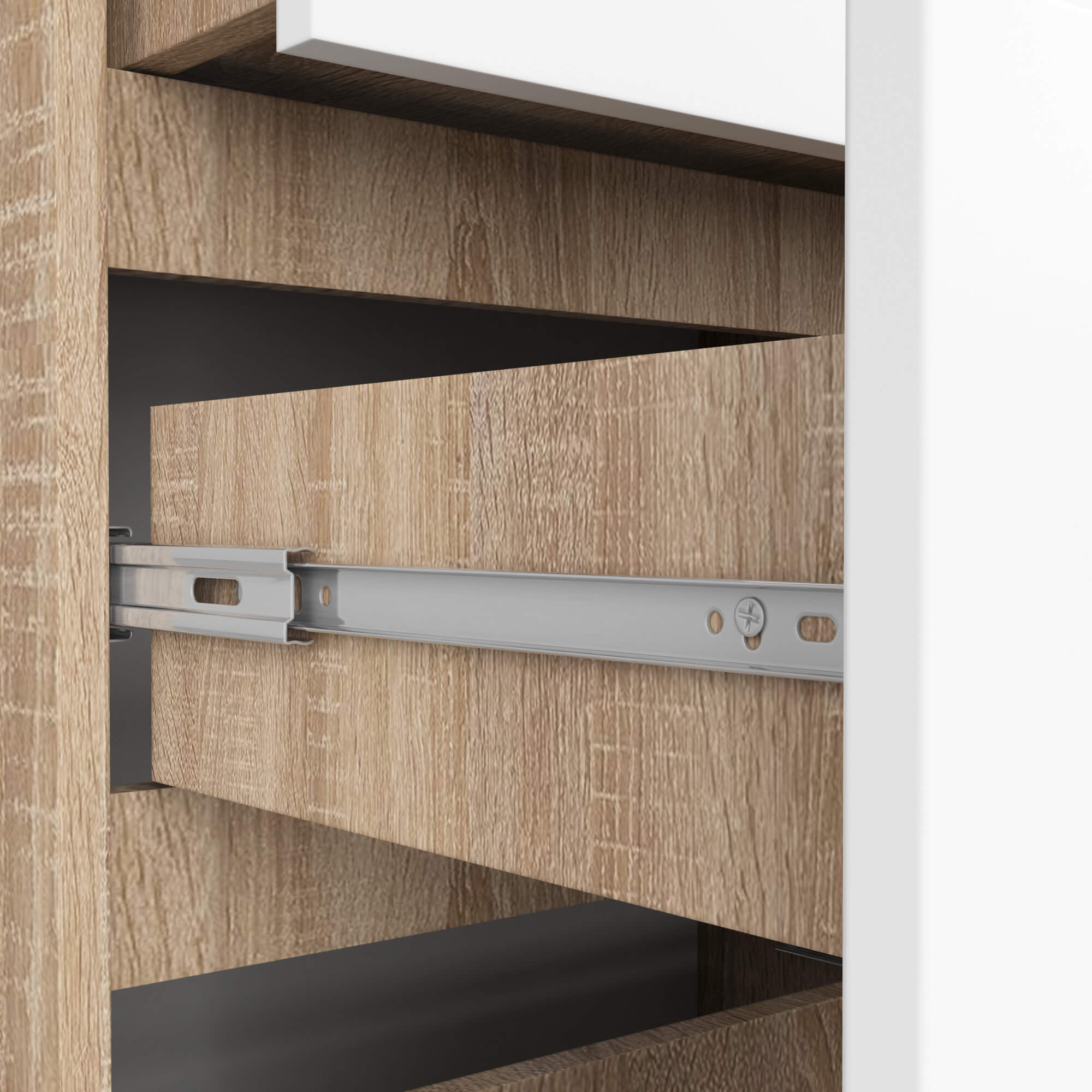 Kancelářský regál R60 v kombinaci dekoru dub sonoma a bílých čel se třemi zásuvkami a dvěma policemi zaujme nadčasovým spojením přirozeného vzhledu dřeva a čisté bílé barvy. Elegantní design se snadno začlení do moderní kanceláře, domácí pracovny i obytných prostor, kde působí harmonicky a vkusně.