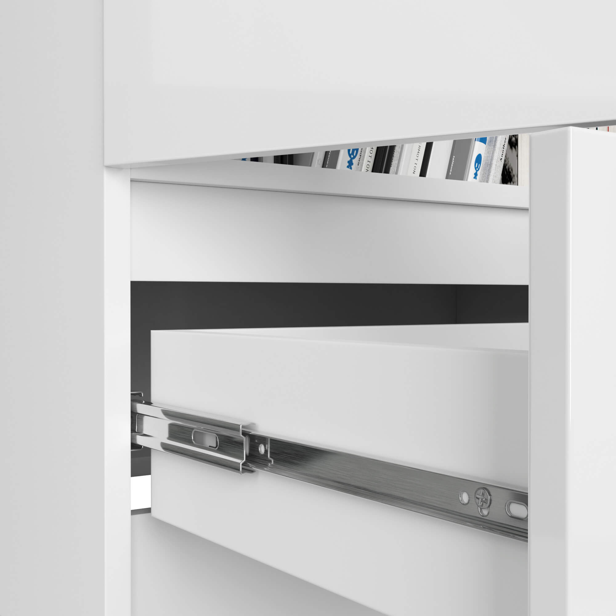 Praktická zásuvka s kovovými pojezdy a blokací výsuvu.