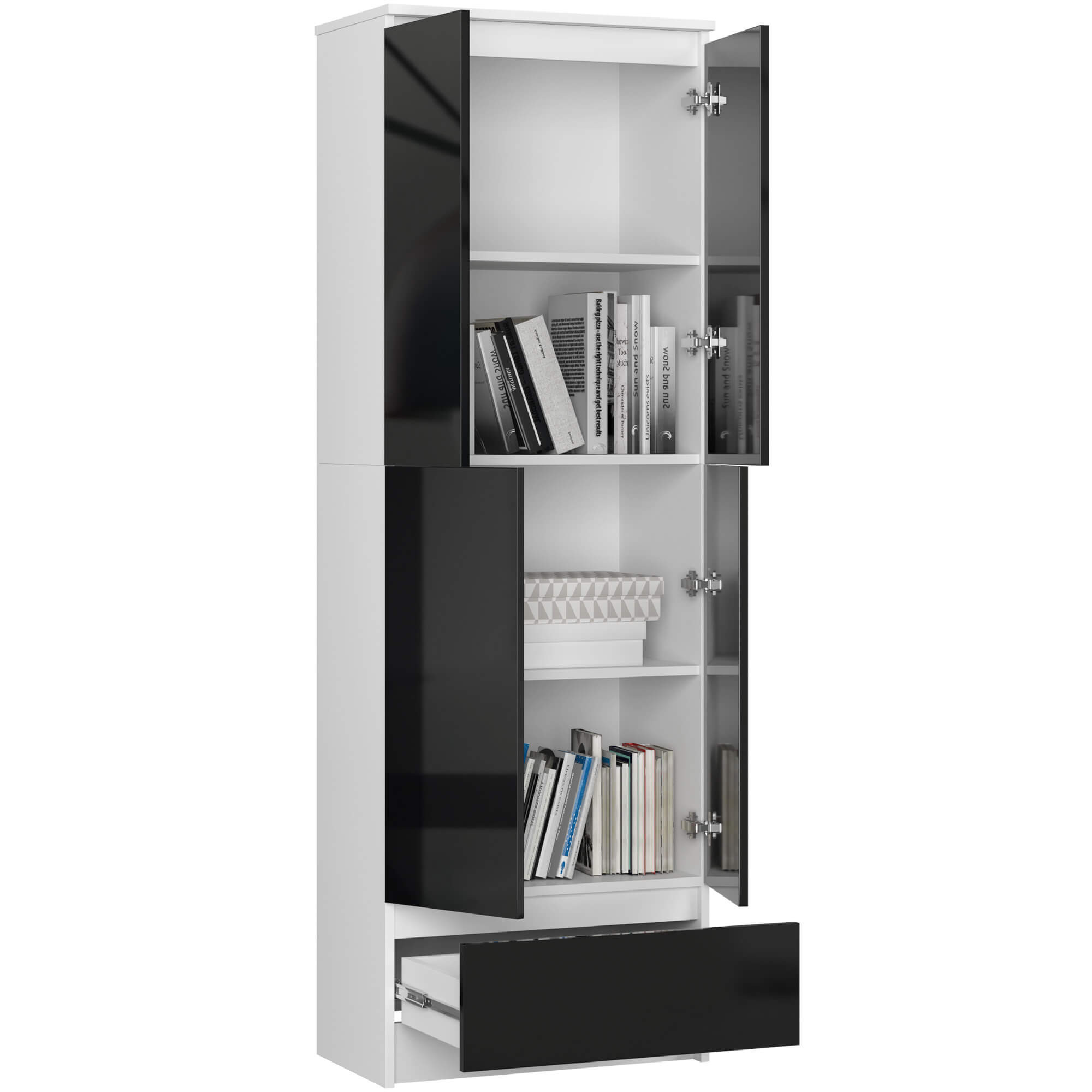 Uzavřený kancelářský regál R60 v kombinaci bílé konstrukce a černých lesklých dvířek se čtyřmi policemi a jednou zásuvkou je stylovým a funkčním řešením pro kancelář i domácí interiér. Kontrast bílé konstrukce a černých dvířek ve vysokém lesku působí moderně, elegantně a dodává nábytku výrazný designový charakter.