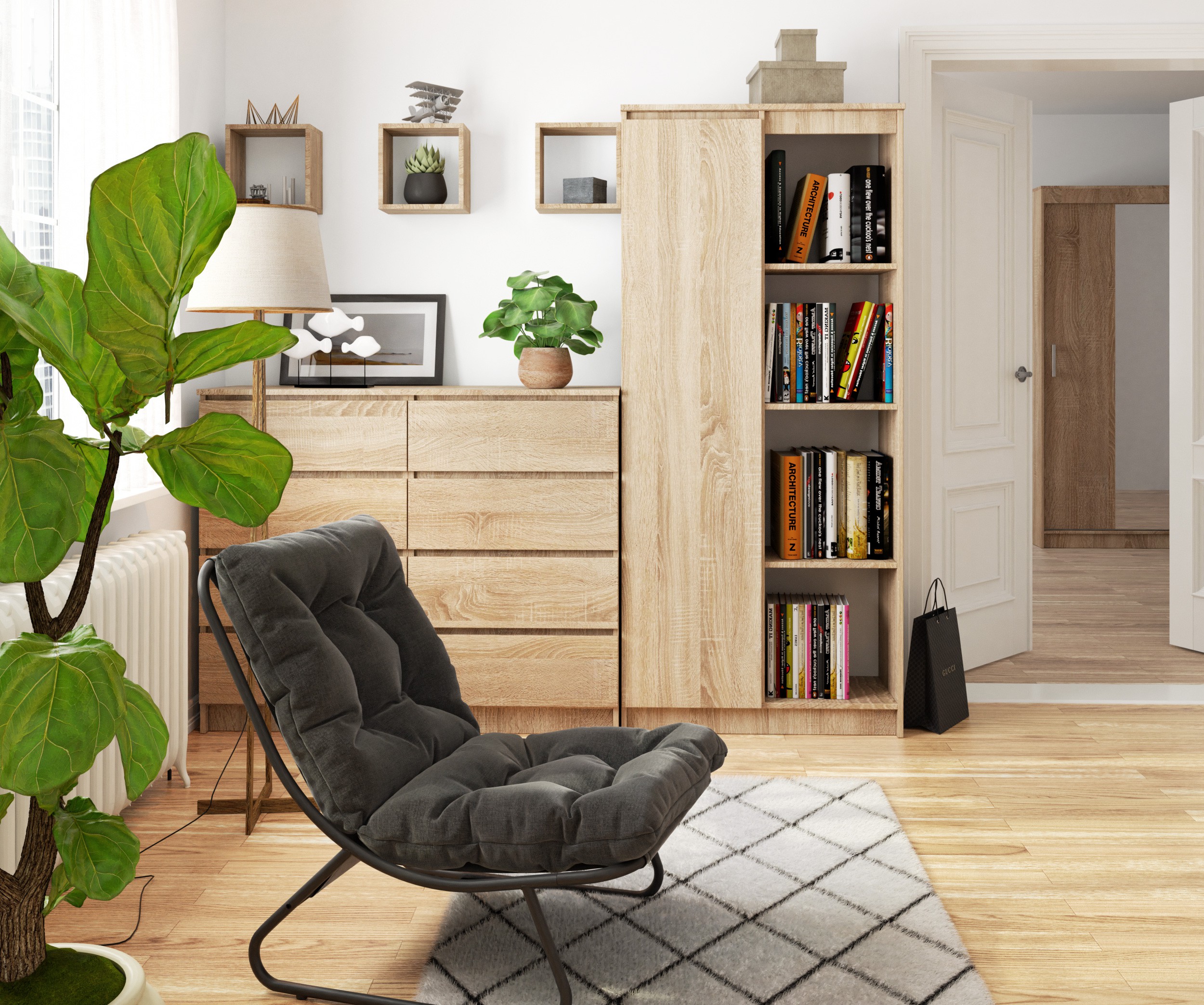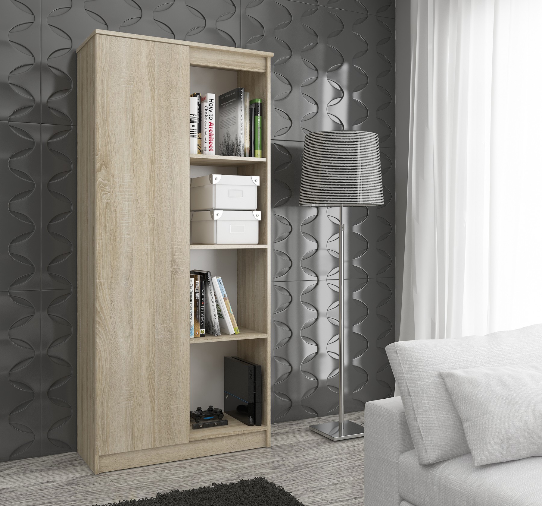 Úložný prostor tvoří celkem osm polic, z nichž část je umístěna za dvířky a umožňuje diskrétní uložení osobních nebo pracovních věcí. Otevřené police jsou ideální pro knihy, šanony nebo dekorace. Dvířka lze namontovat na pravou i levou stranu podle dispozic prostoru, což zvyšuje flexibilitu při umístění regálu.