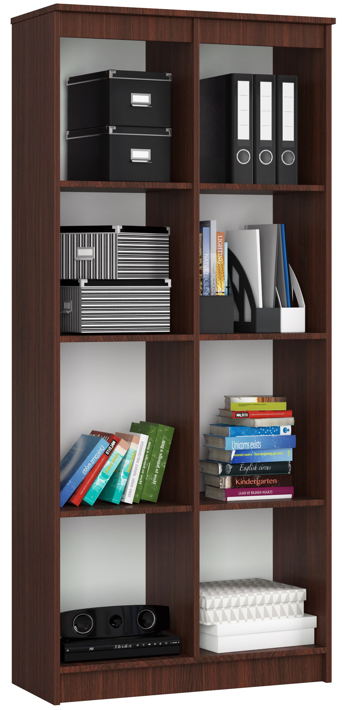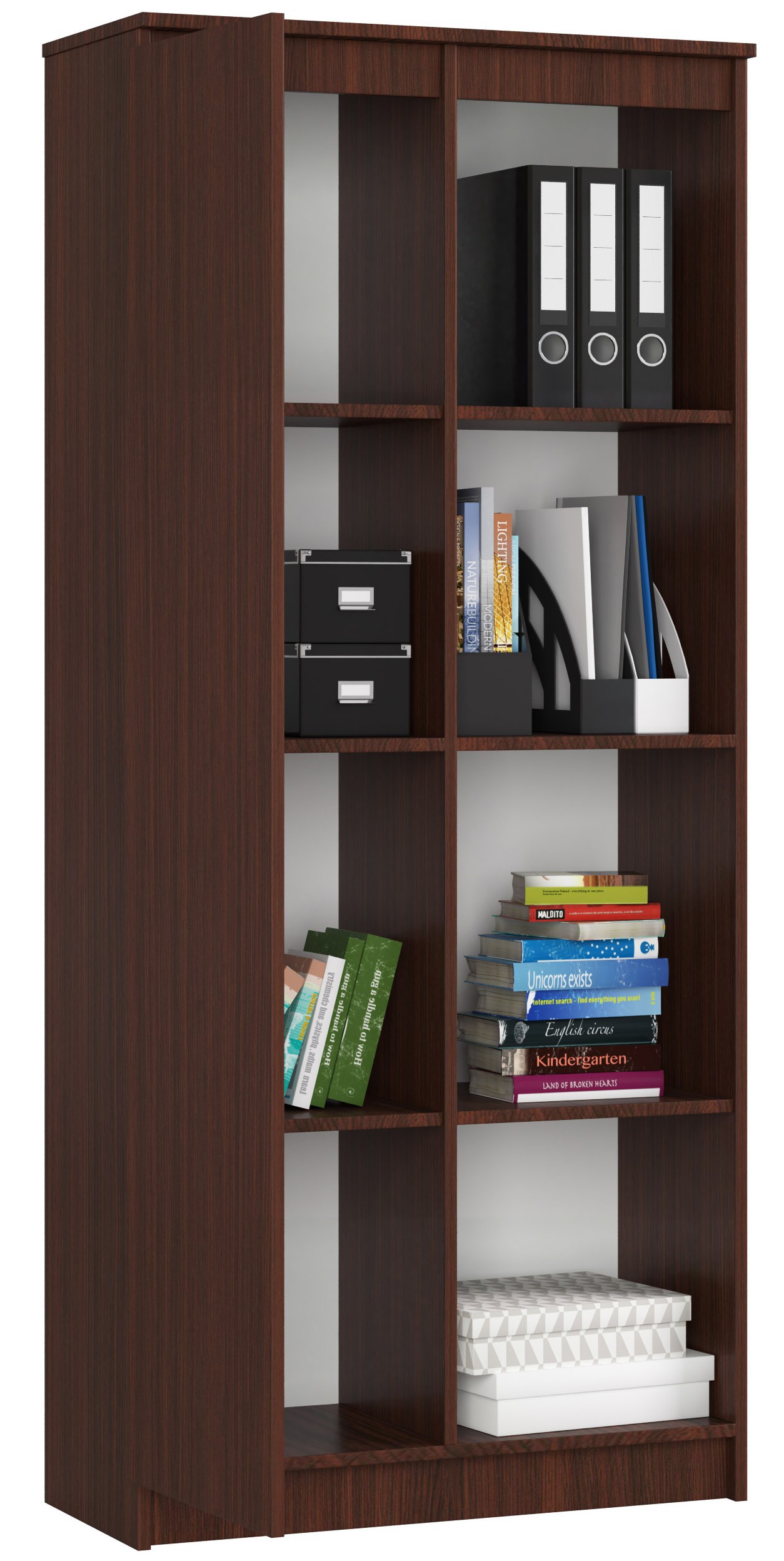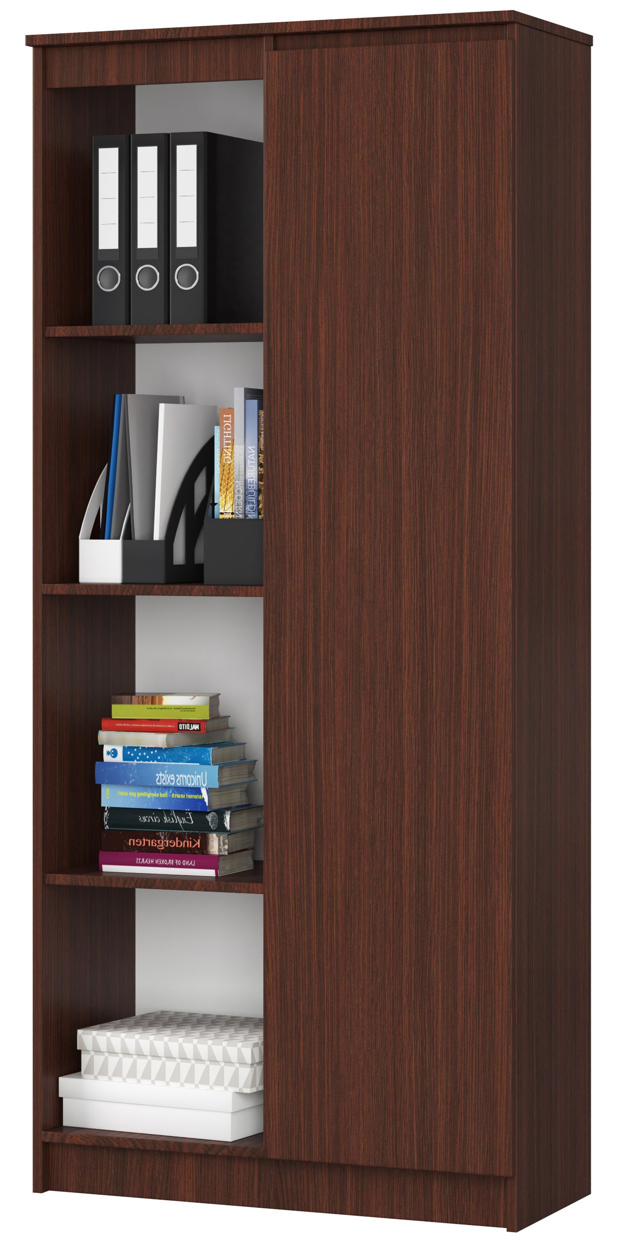 Kancelářský regál R80 v dekoru wenge s osmi policemi a jedněmi dvířky je praktickým a zároveň stylovým řešením pro ukládání dokumentů, knih i dalších předmětů. Tmavý dekor wenge dodává nábytku elegantní a nadčasový vzhled, který se skvěle hodí do moderních kanceláří i obytných prostor.