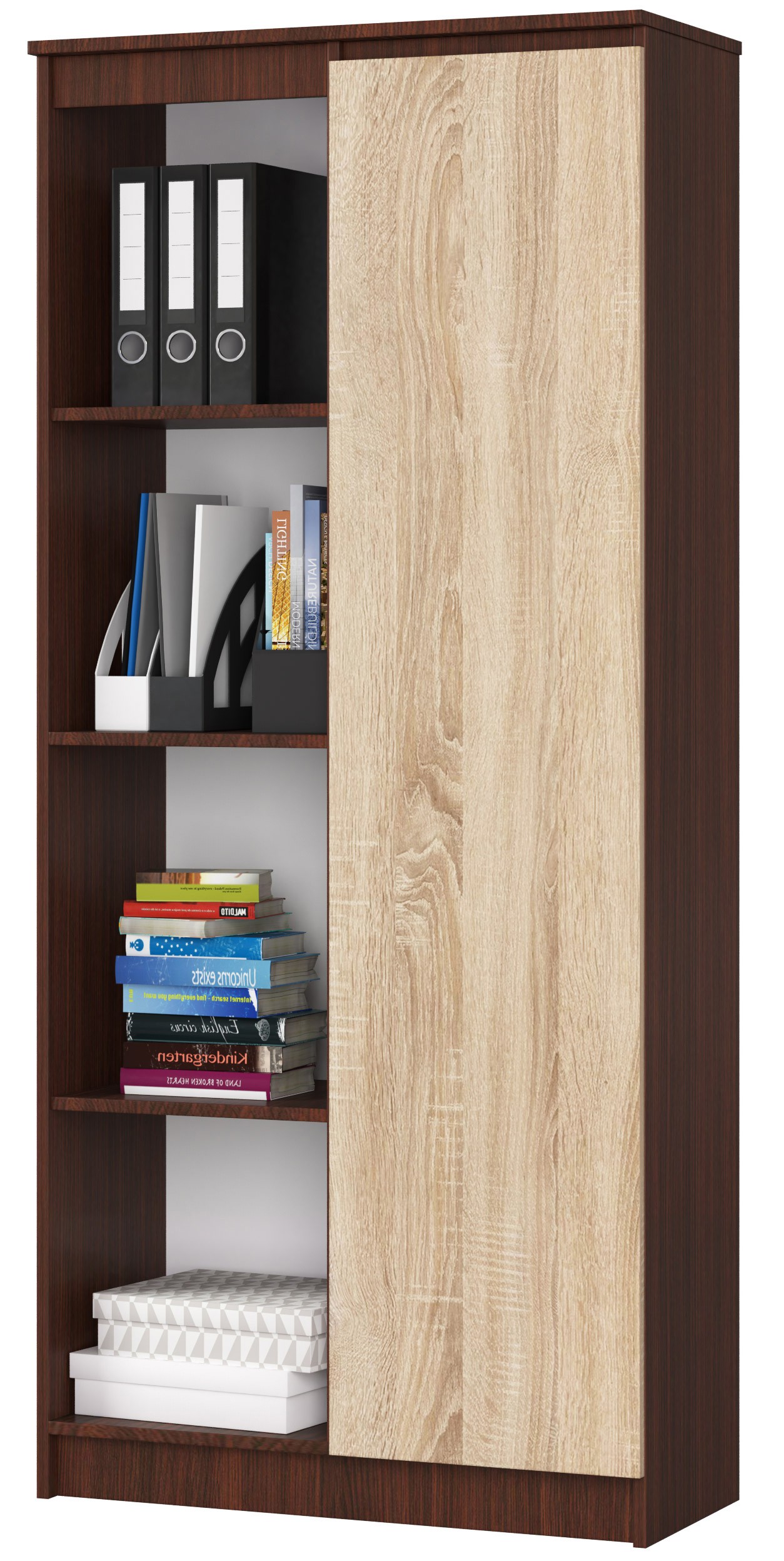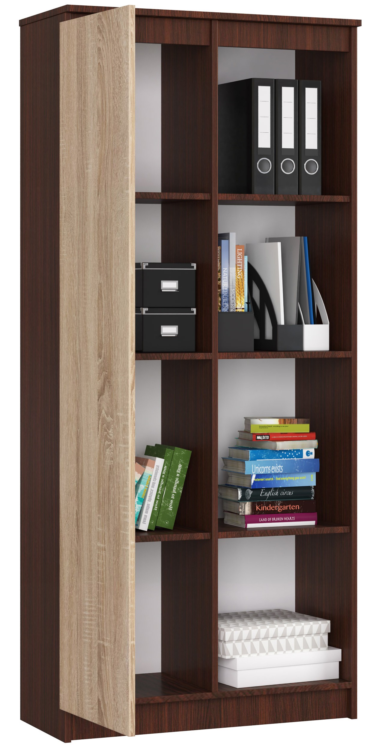 Kancelářský regál R80 v dekoru wenge s dvířky v dekoru dub sonoma a osmi policemi je praktickým a elegantním řešením pro ukládání dokumentů, knih i kancelářských potřeb. Kombinace tmavšího dekoru wenge a světlého dekoru dub sonoma působí moderně a přirozeně zároveň a snadno se sladí s ostatním nábytkem.