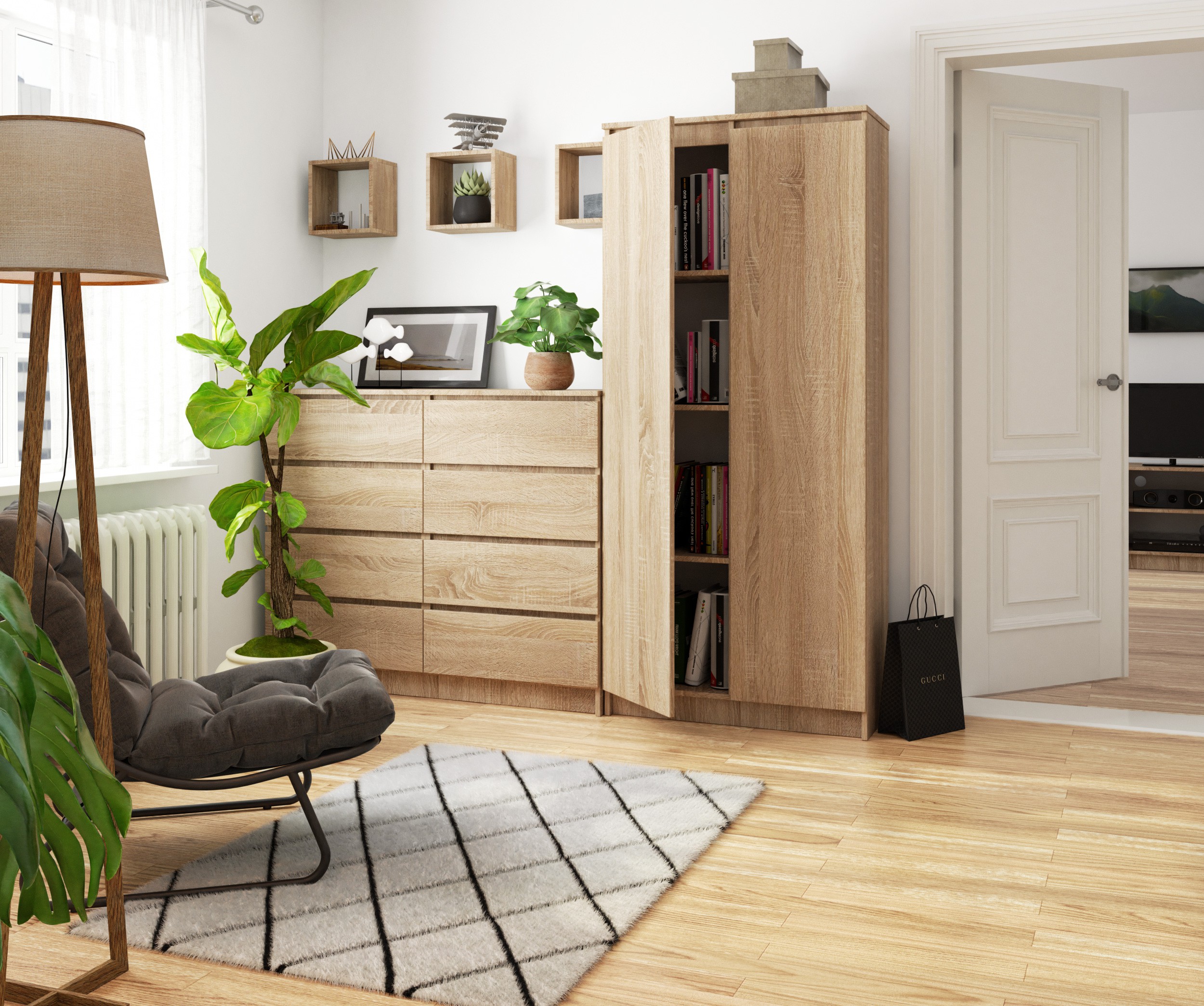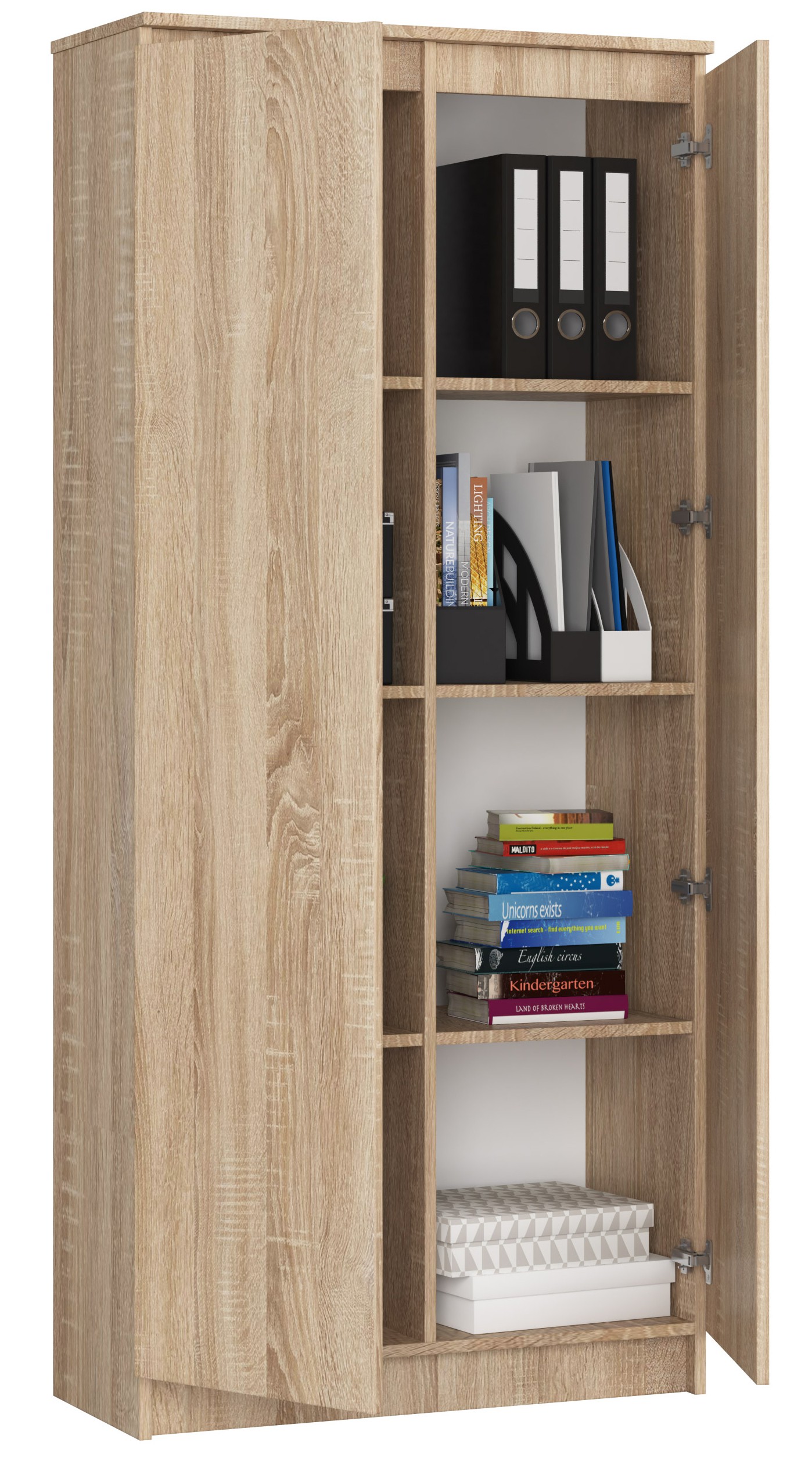 Kancelářský regál R80 v dekoru dub sonoma se dvěma dveřmi a osmi policemi je praktickým a elegantním řešením pro kanceláře i domácnosti. Světlý dekor dub sonoma působí přirozeně, útulně a snadno jej sladíte s moderním i klasickým vybavením. Díky uzavíratelnému provedení je ideální pro ty, kteří chtějí mít uložené věci přehledně uspořádané a zároveň skryté před pohledy.