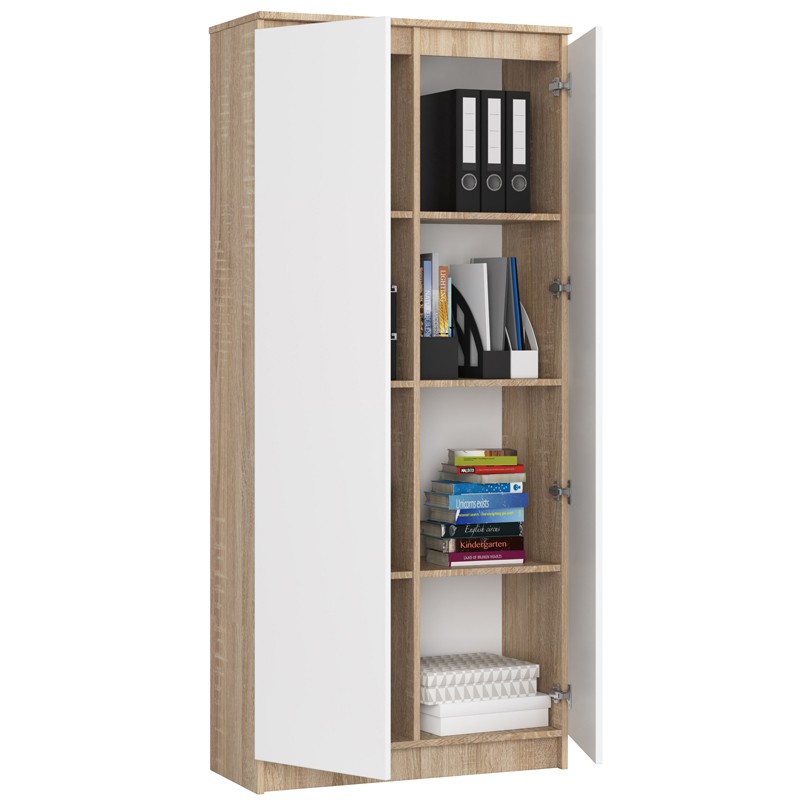 Uzavřený kancelářský regál R80 v dekoru dub sonoma s bílými dvířky a osmi policemi je moderním a praktickým řešením pro ukládání dokumentů, knih i dalších předmětů. Kombinace světlého dekoru dřeva dub sonoma a bílých čel působí nadčasově, elegantně a snadno se kombinuje s ostatním nábytkem v kanceláři i domácím interiéru.