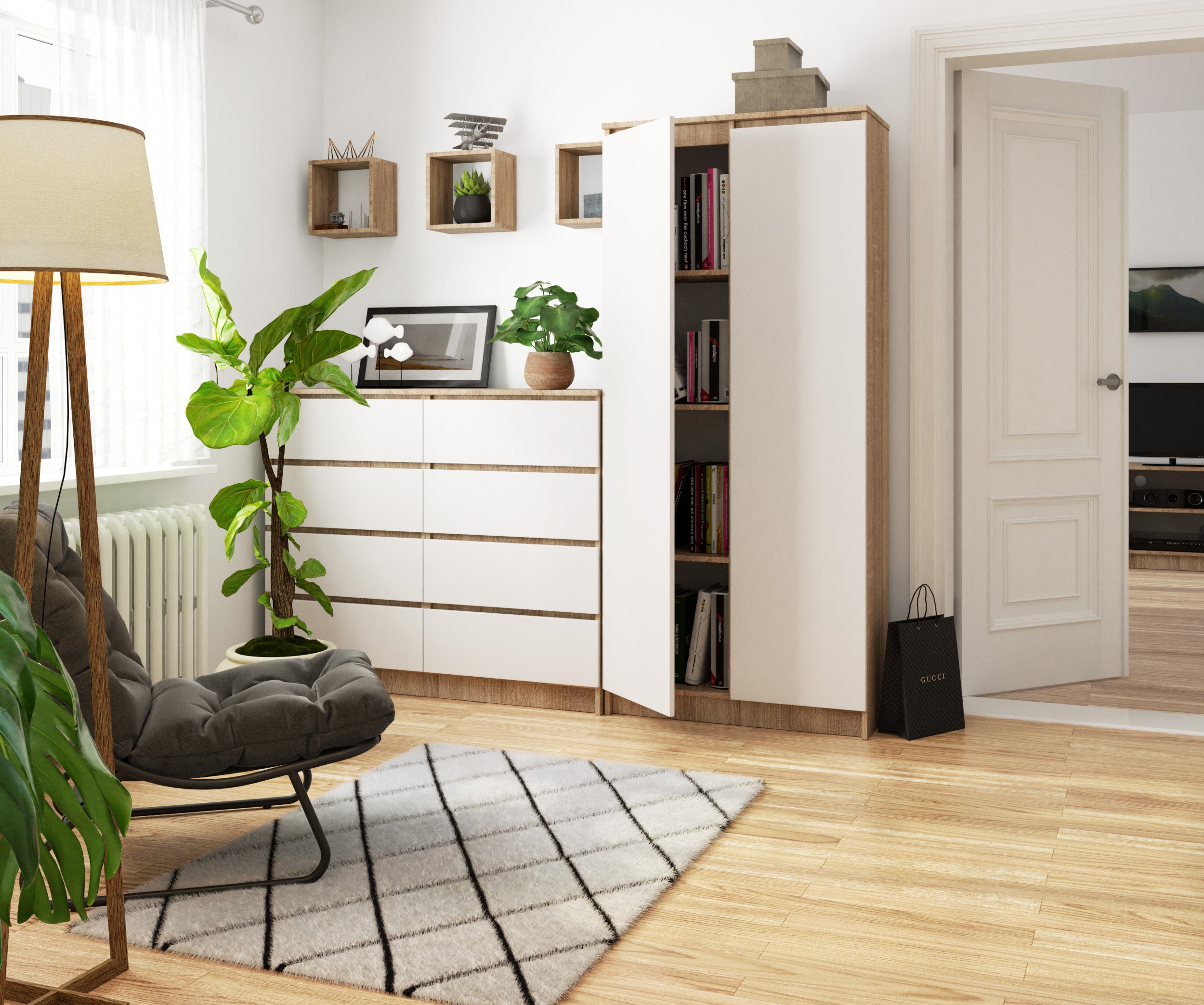 Kombinace dekoru dub sonoma a bílých dvířek.