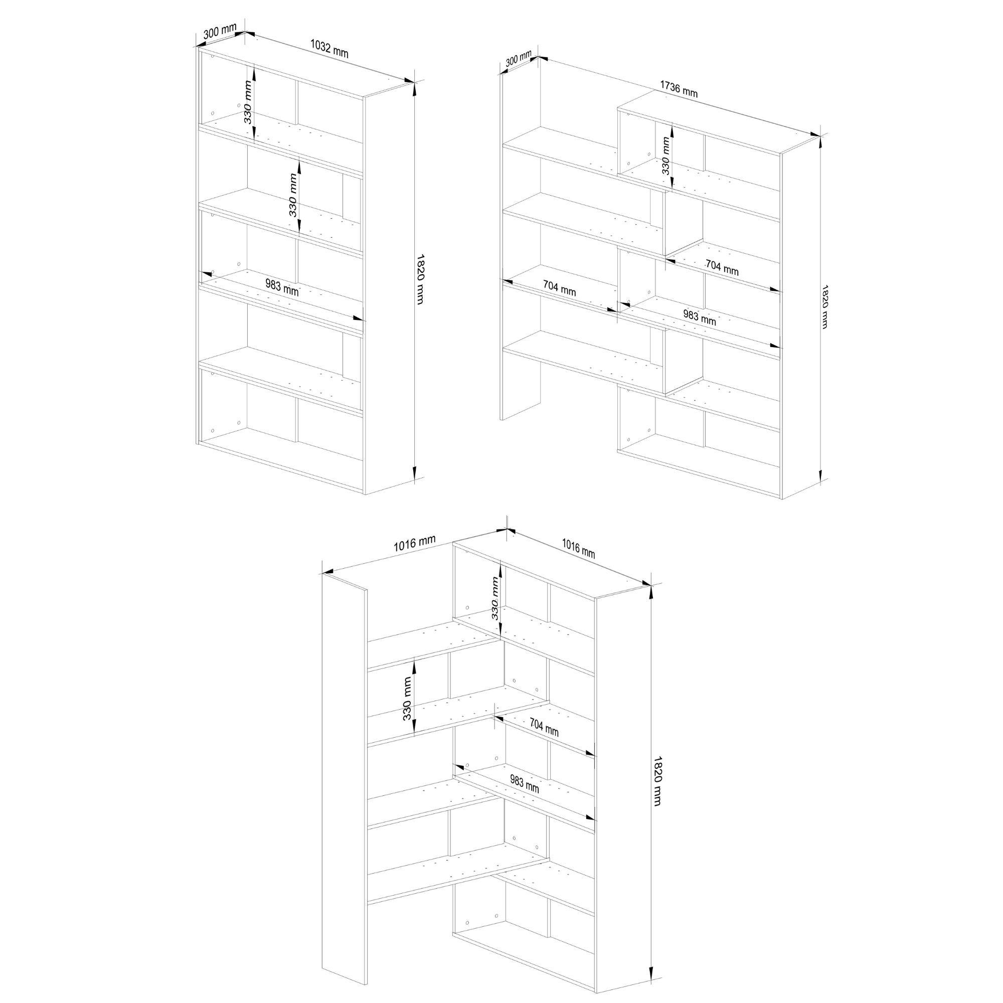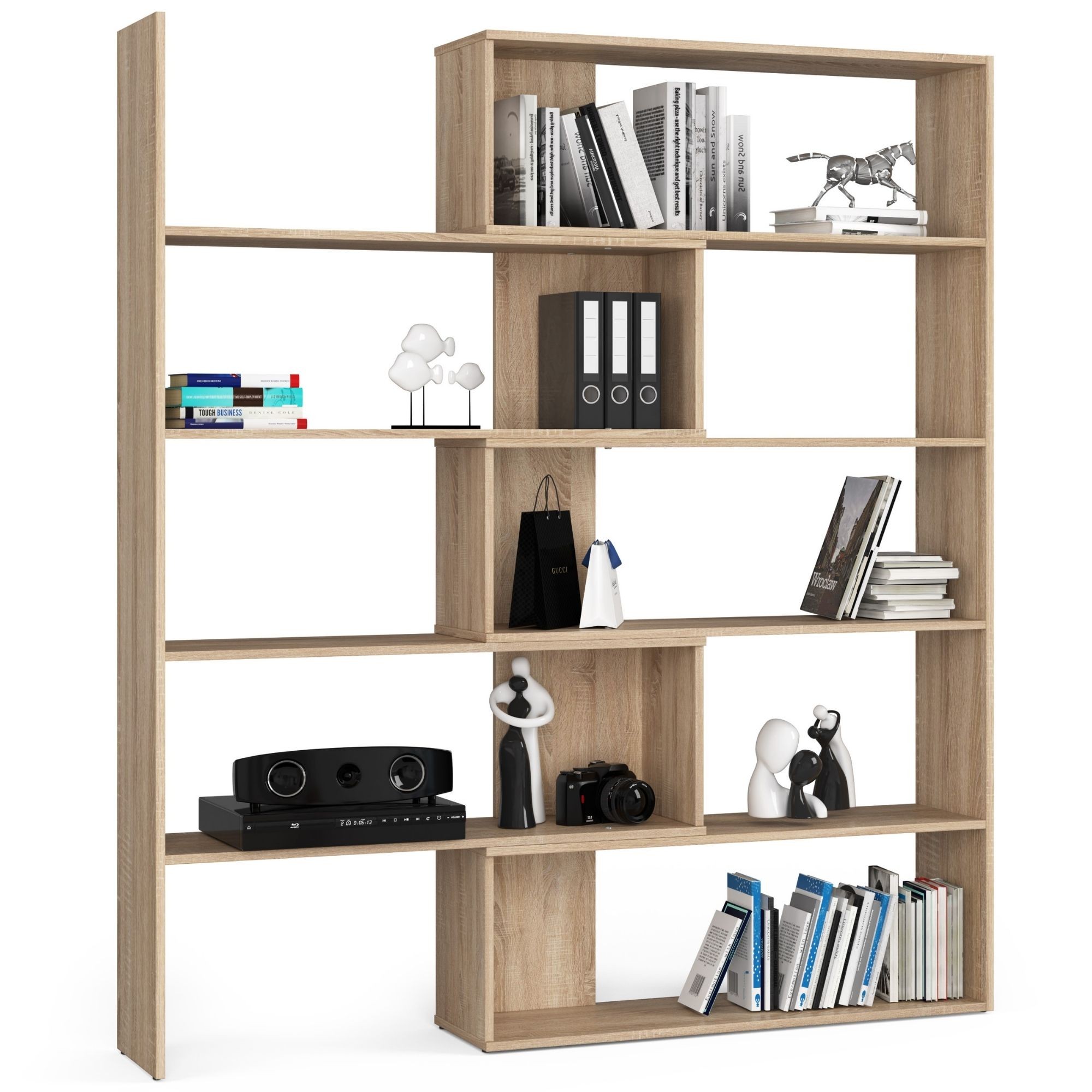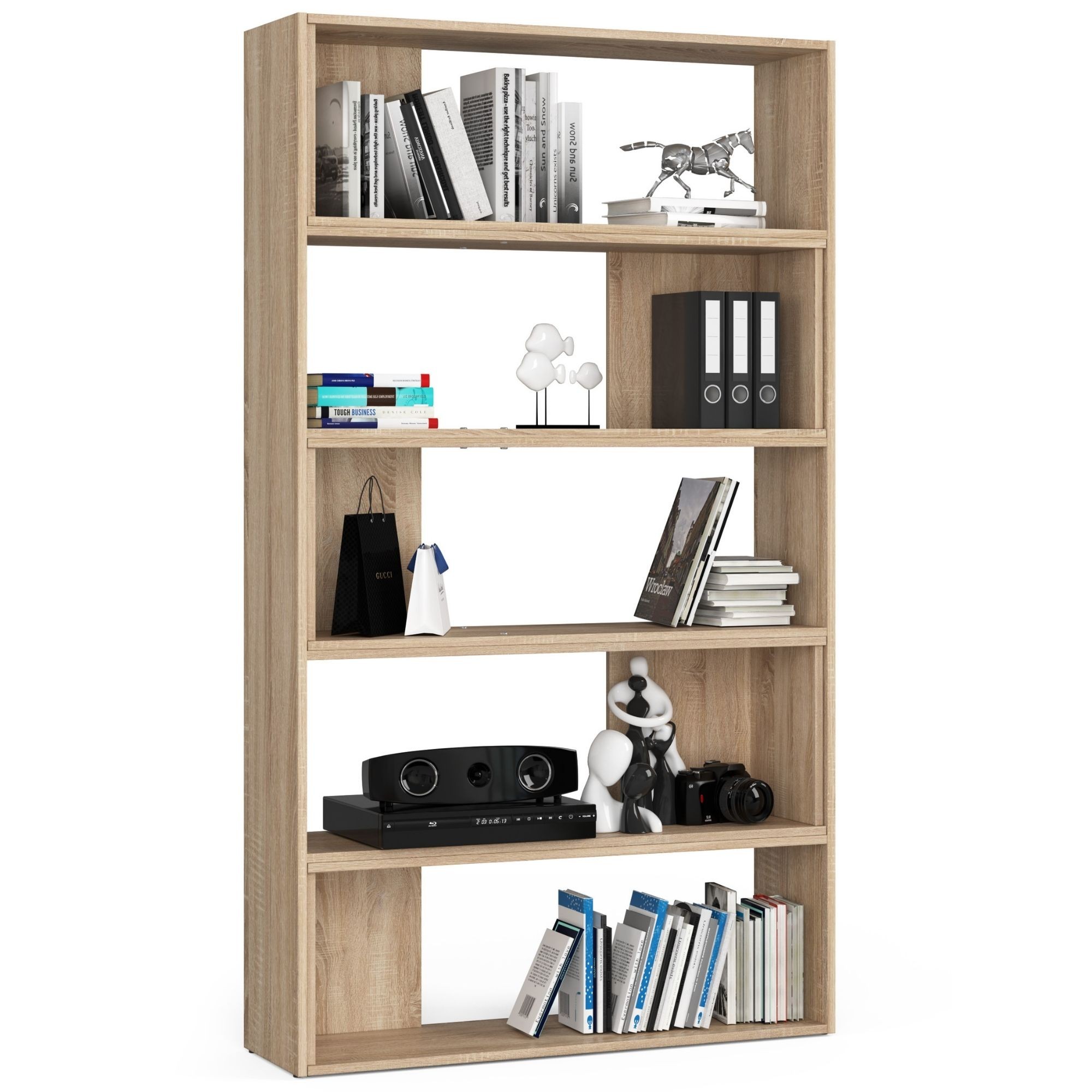 V základní sestavě nabízí regál pět prostorných polic, které lze využít k uložení knih, dekorací, hraček, dokumentů nebo kancelářských doplňků. Díky přírodnímu dekoru dub sonoma působí regál nadčasově a snadno se kombinuje s dalším nábytkem.