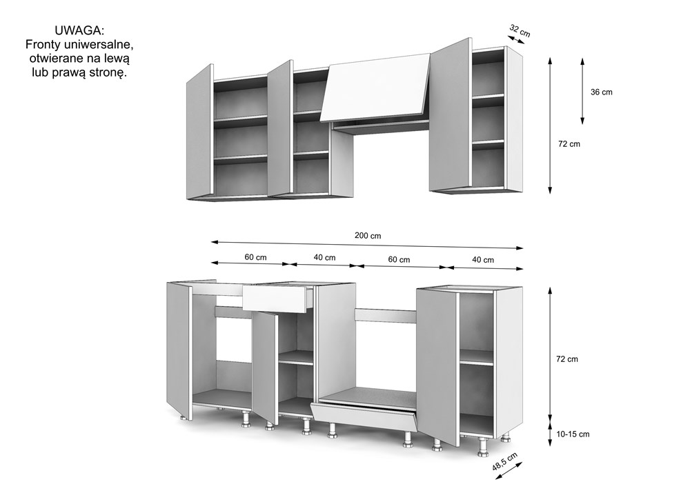 Kuchyňská sestava o šířce 200 cm je ideálním řešením pro menší obytné prostory, jako jsou garsonky či kompaktní byty. Skříňky jsou vybaveny černými úchyty, které jsou nejen praktické, ale zároveň tvoří stylový detail podtrhující moderní vzhled nábytku. Systém otevírání dvířek zajišťuje snadný přístup do vnitřního prostoru skříněk, což je obzvlášť důležité tam, kde záleží na každém centimetru. Tato kuchyňská sestava byla navržena s důrazem na maximální funkčnost a efektivní využití prostoru, aniž by utrpěl její estetický vzhled. Je ideální volbou pro první bydlení, garsonku nebo jako praktické vybavení kuchyně na chatě či chalupě. Sestava je dodávána bez spotřebičů, dřezu a baterie.