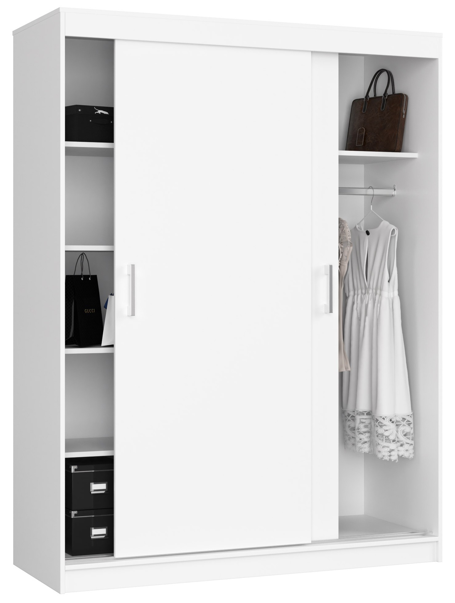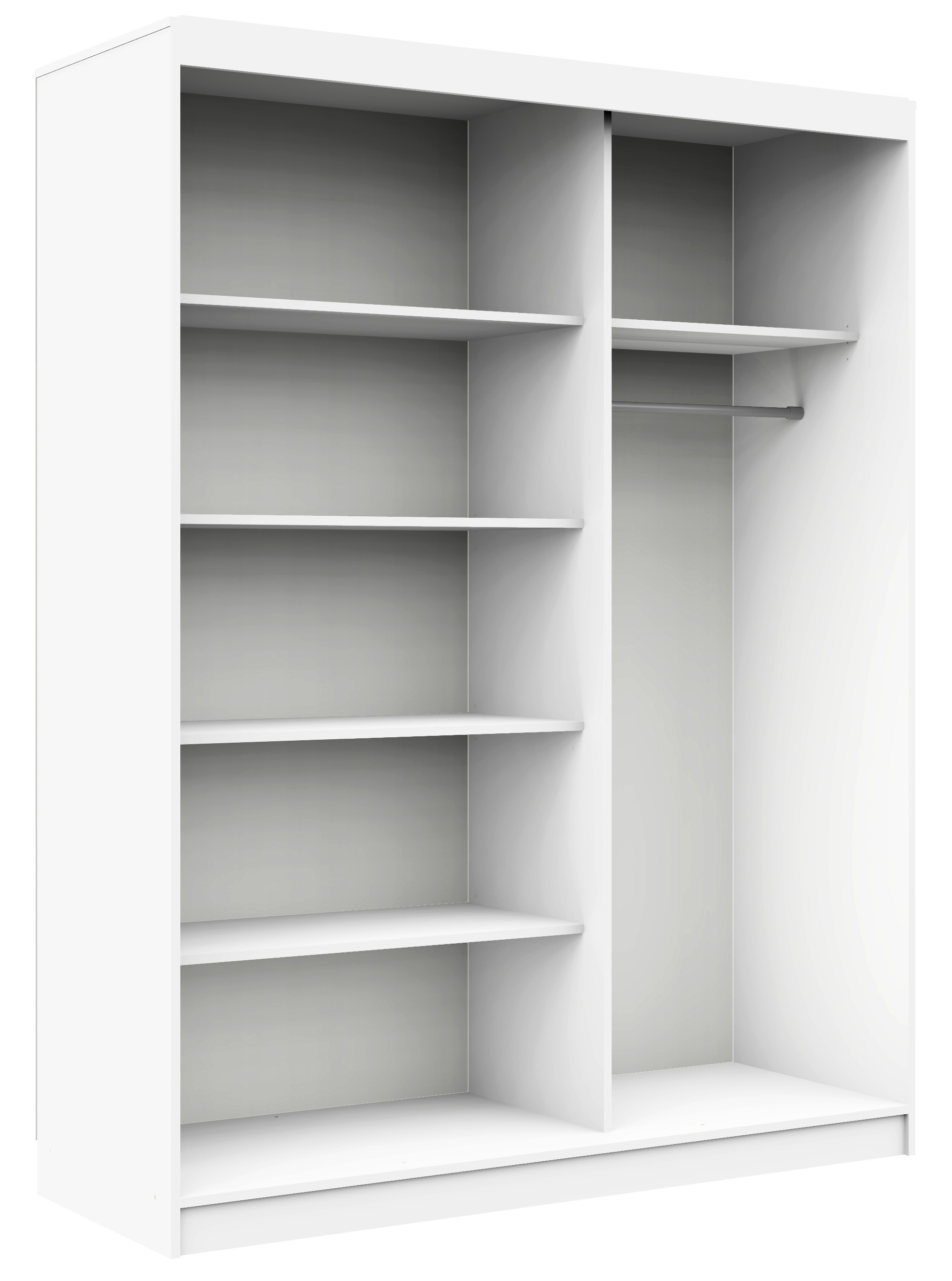 Posuvná šatní skříň Mono 150 cm v bílém provedení je ideální volbou pro moderní interiéry, kde je kladen důraz na jednoduchý design, funkčnost a světlý vzhled. Díky posuvným dveřím bez zrcadel na hliníkových kolejnicích je vhodná i do místností s omezeným prostorem.