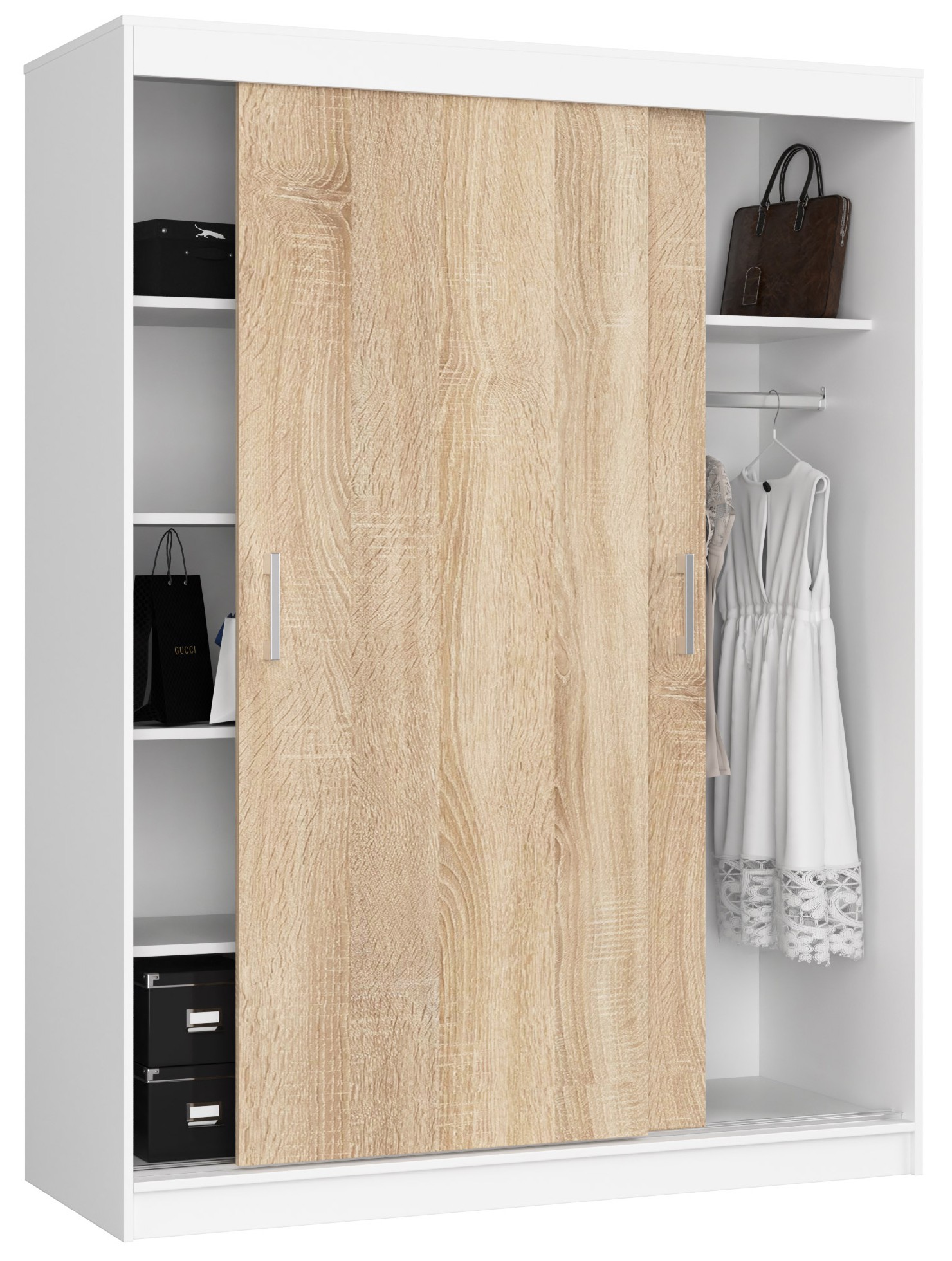 Posuvná šatní skříň Mono 150 cm je prostorným a elegantním řešením pro předsíň, ložnici i šatnu. Kombinuje bílý korpus s posuvnými dveřmi v dekoru dub sonoma, které věrně imitují strukturu a kresbu přírodního dřeva. Díky tomu působí moderně, nadčasově a snadno zapadne do různých typů interiérů.