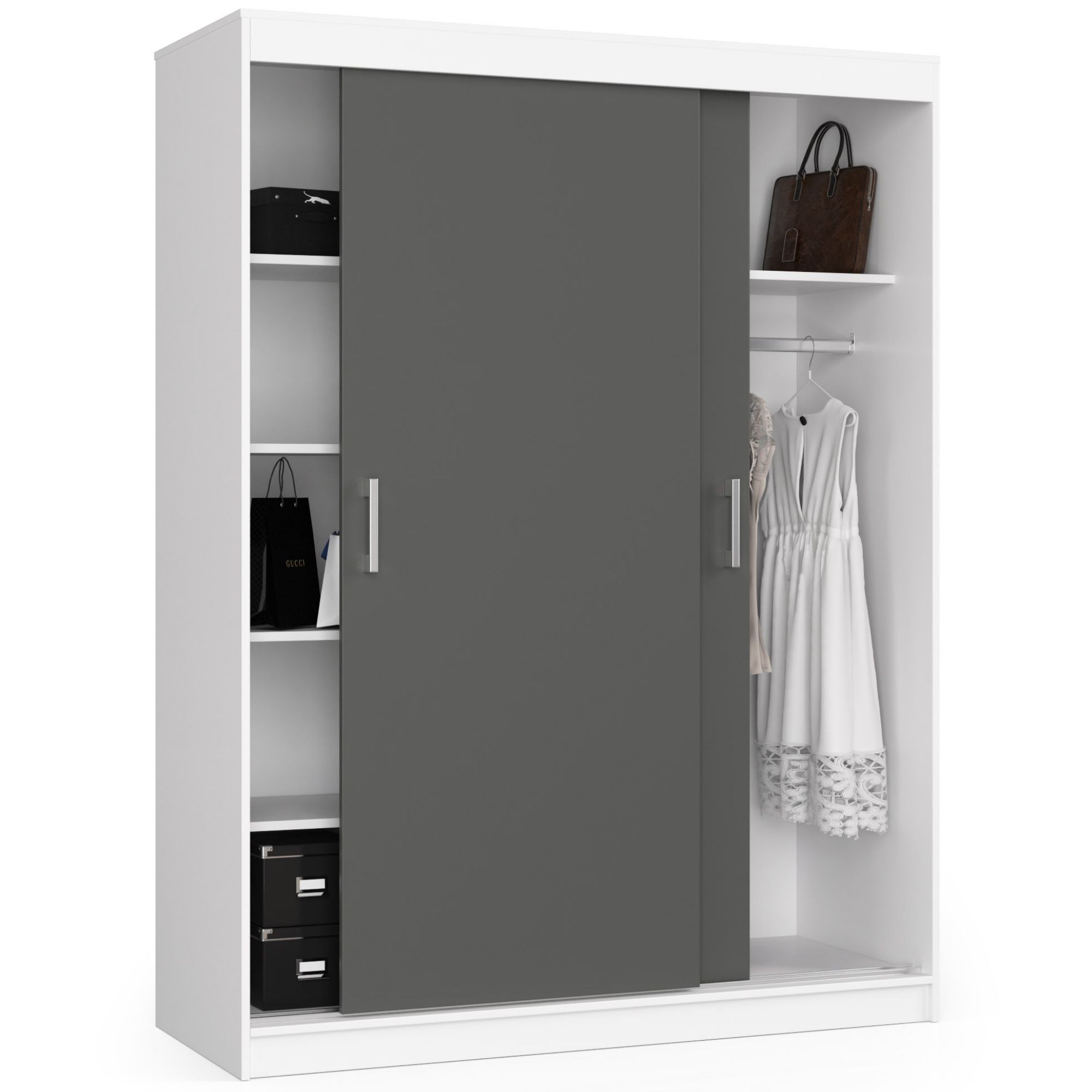 Posuvná šatní skříň Mono CLP v kombinaci bílé konstrukce a grafitových posuvných dveří je praktickým řešením pro předsíň, ložnici i kancelářské prostory. Jednoduchý a univerzální design umožňuje snadné začlenění do moderních i klasických interiérů a vytváří vizuálně čistý a uspořádaný dojem.