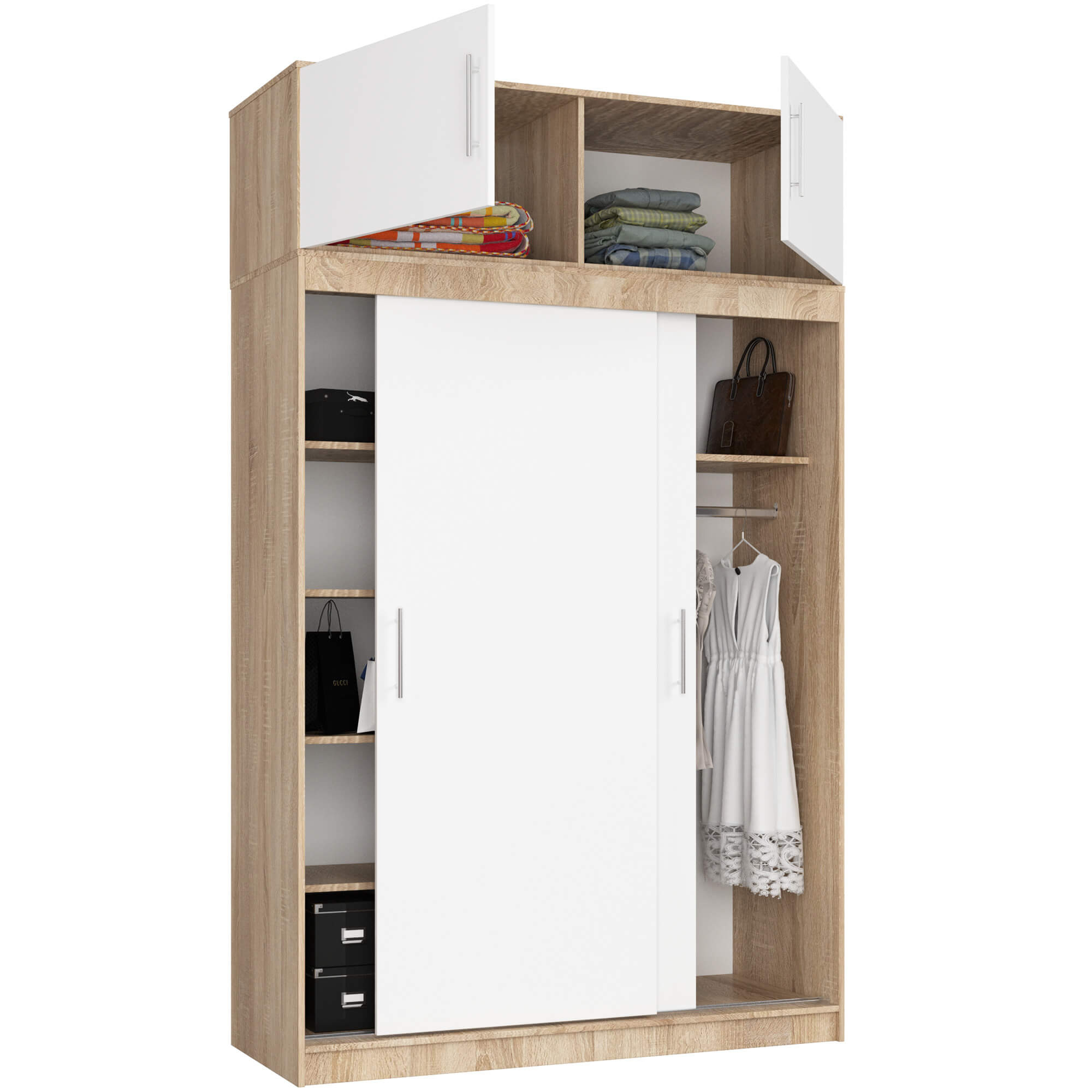 Skříň se skládá ze dvou segmentů. Spodní část je vybavena dvěma posuvnými dveřmi a nabízí šest prostorných polic spolu s praktickou šatní tyčí, která slouží k zavěšení košil, šatů, obleků nebo svrchního oblečení. Horní část tvoří nástavba uzavíratelná dvěma dveřmi, která je vybavena dvěma policemi a je ideální pro uložení sezónních nebo méně často používaných věcí.