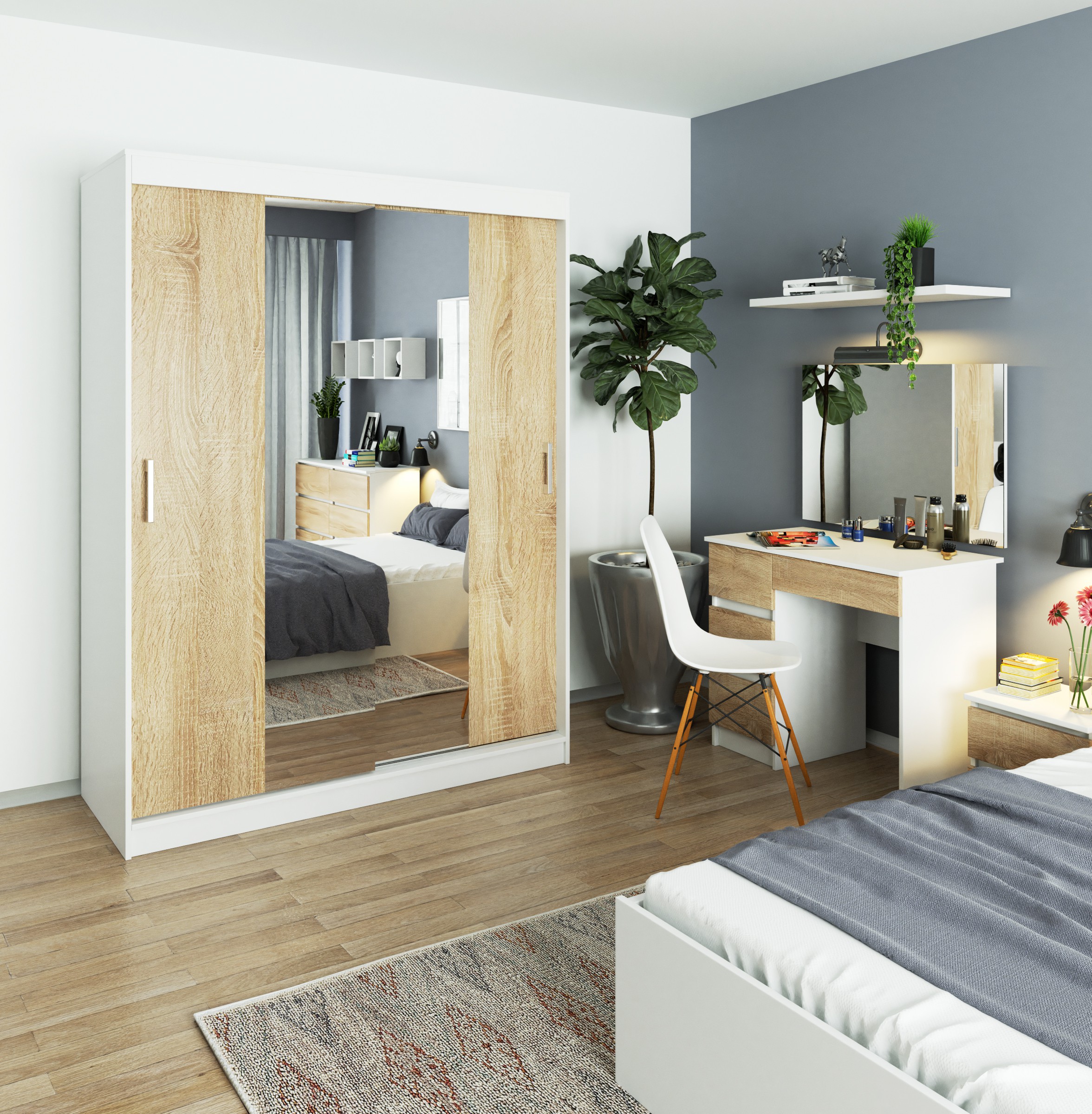 Skříň je navržena tak, aby poskytla dostatek prostoru pro dvě osoby a zároveň šetřila místo v interiéru. Díky posuvnému systému na hliníkových kolejnicích se dveře otevírají plynule a bez zbytečných nároků na prostor. Praktickým prvkem je také integrované zrcadlo, které umožní rychlou kontrolu outfitu a oceníte ho zejména v předsíni nebo šatně.