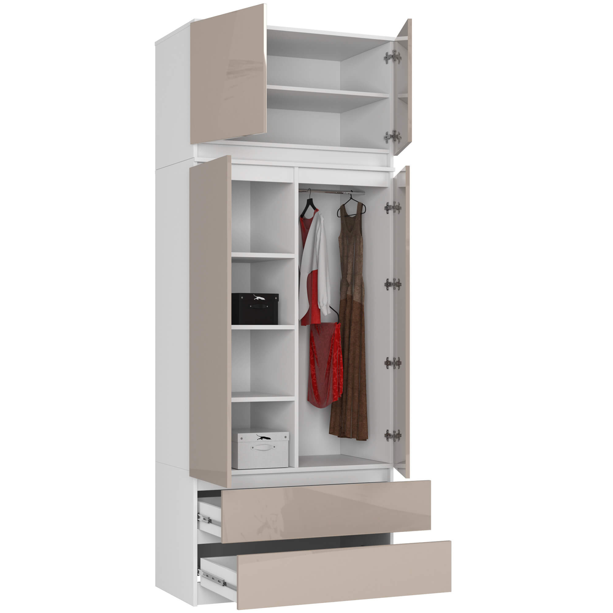 šatní skříň se dvěma dveřmi, dvěma zásuvkami a nástavbou