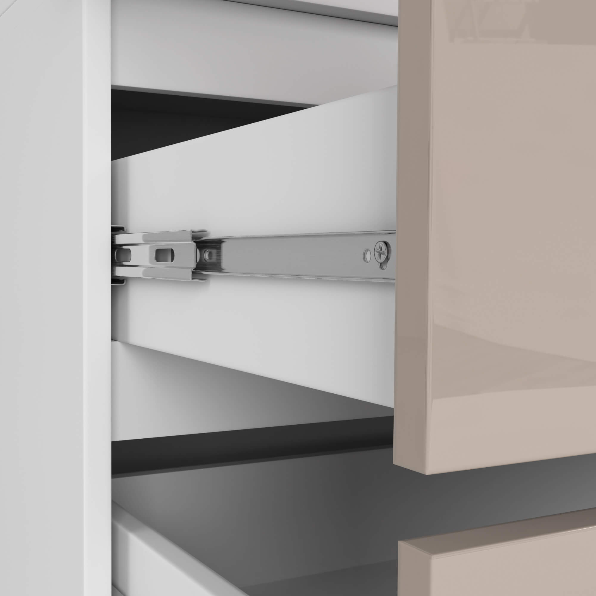 Spodní část skříně tvoří dvě praktické zásuvky, které se pohybují na kvalitních kovových kuličkových pojezdech renomované značky GTV. Jsou ideální pro uložení spodního prádla, doplňků nebo drobných textilií. Střední část skříně nabízí úložný prostor s policemi a šatní tyčí pro zavěšení oblečení.