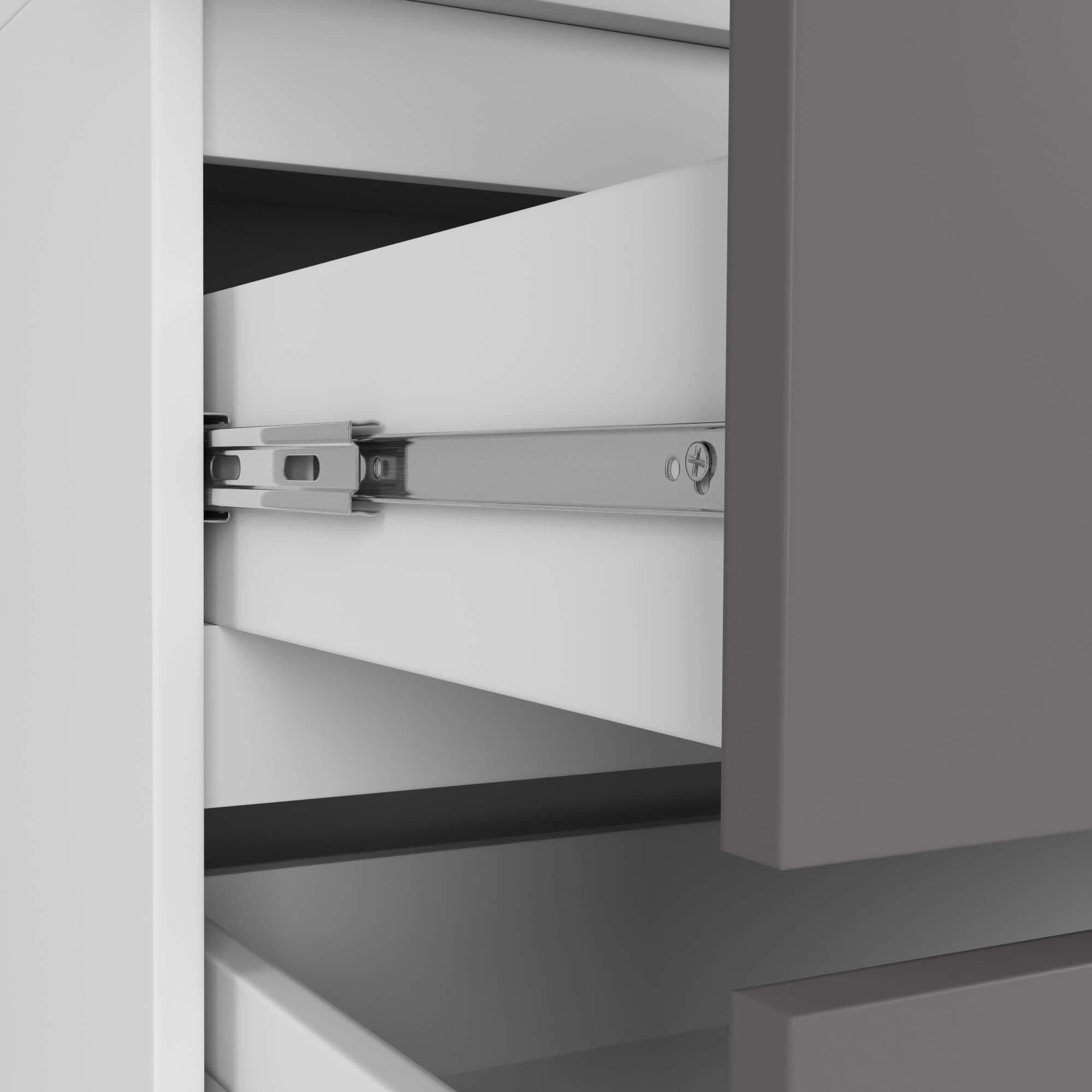 Konstrukce skříně je vyrobena z kvalitní laminované desky Kronospan o tloušťce 16 mm, která je odolná proti oděru a mechanickému poškození. Viditelné hrany jsou opatřeny ochranným ABS obrzežením, které prodlužuje životnost nábytku a zachovává jeho estetický vzhled i při dlouhodobém používání. Zásuvky jsou osazeny kovovými pojezdy pro plynulý a spolehlivý chod. Skříň lze zakoupit samostatně nebo v kombinaci s komodou ze stejné série.