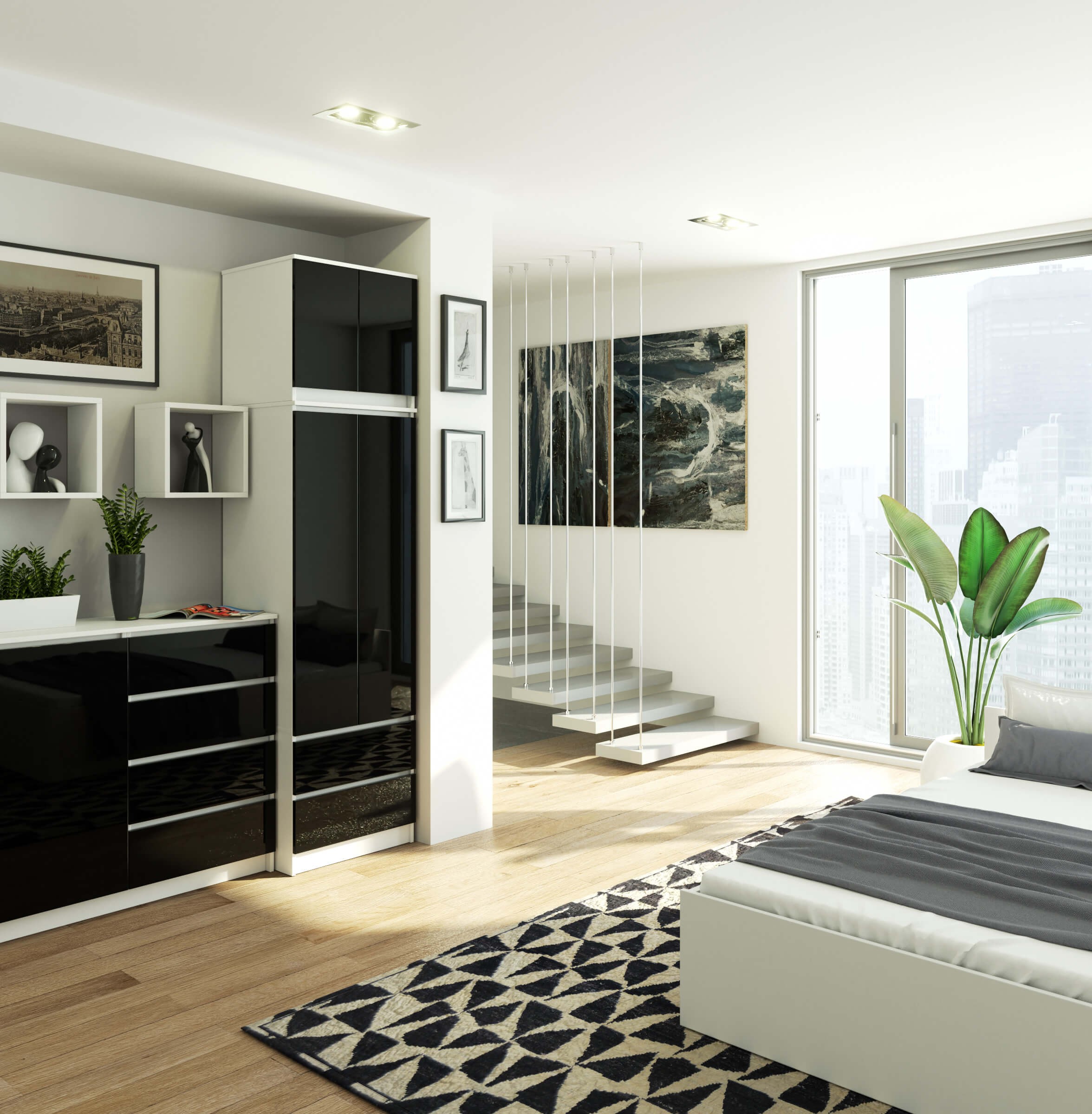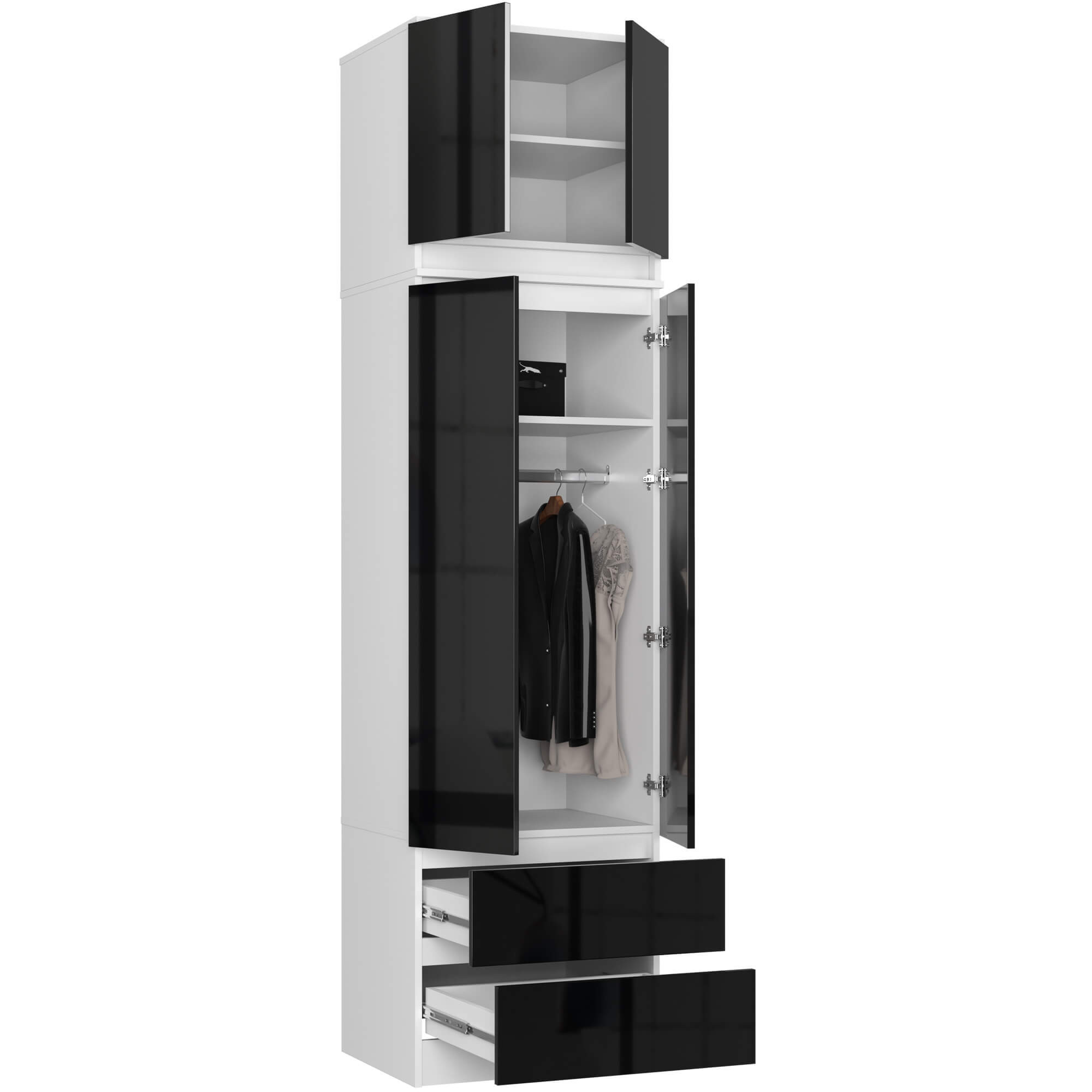 Šatní skříň Star S60 s nástavbou se dvěma dveřmi a dvěma zásuvkami v kombinaci bílé barvy a černého vysokého lesku je moderním a elegantním řešením pro ukládání oblečení i domácích doplňků. Díky nástavbě poskytuje výrazně větší úložný prostor, aniž by zabírala více místa na podlaze, což ocení zejména majitelé menších bytů.