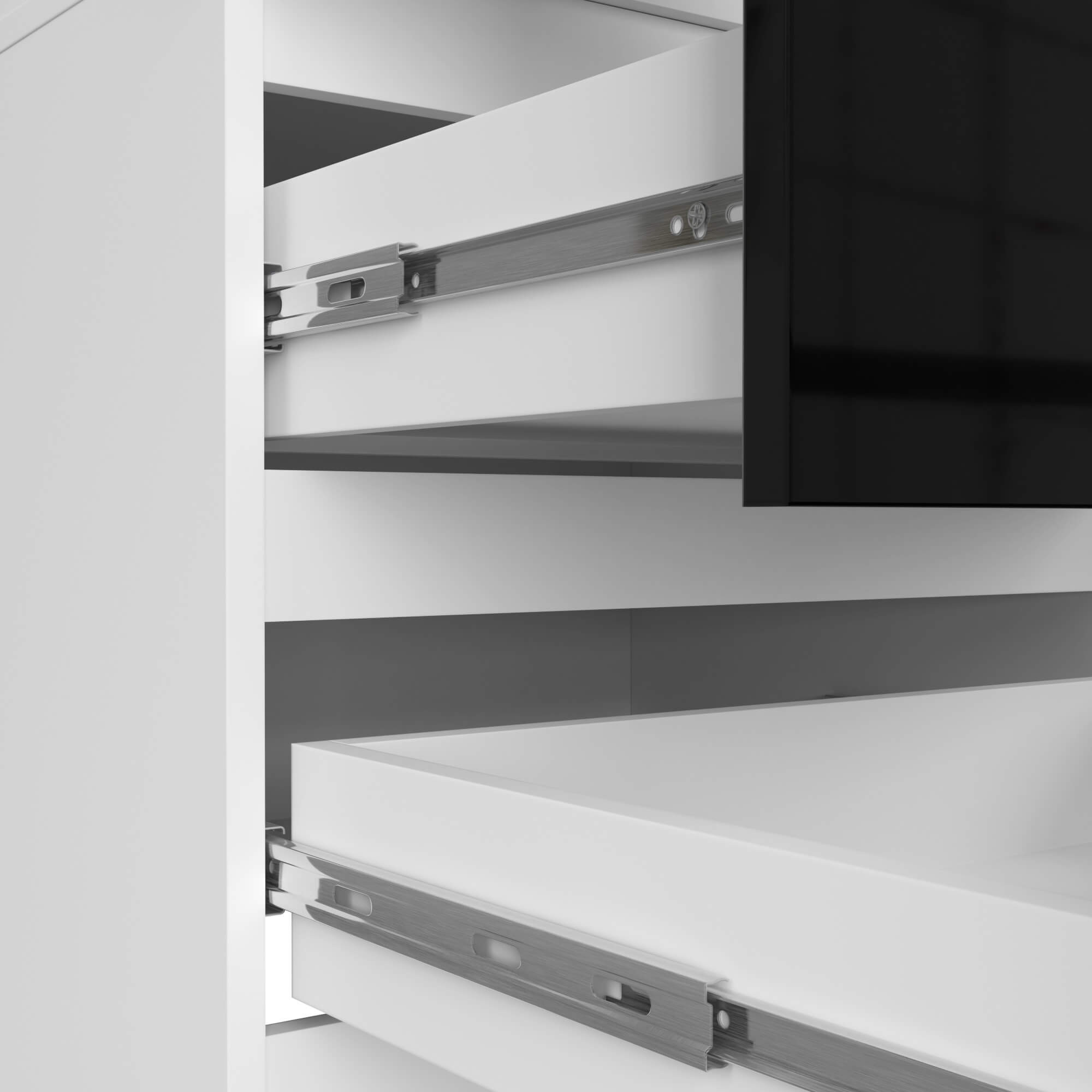 Spodní část skříně je vybavena dvěma zásuvkami, které jsou ideální pro uložení prádla, doplňků nebo jiných drobností. Zásuvky jsou osazeny kvalitními kovovými kuličkovými pojezdy renomované značky GTV, které zajišťují plynulý, tichý a spolehlivý chod. Za dveřmi se nachází praktická police a šatní tyč určená pro zavěšení košil, šatů, bund nebo kabátů.