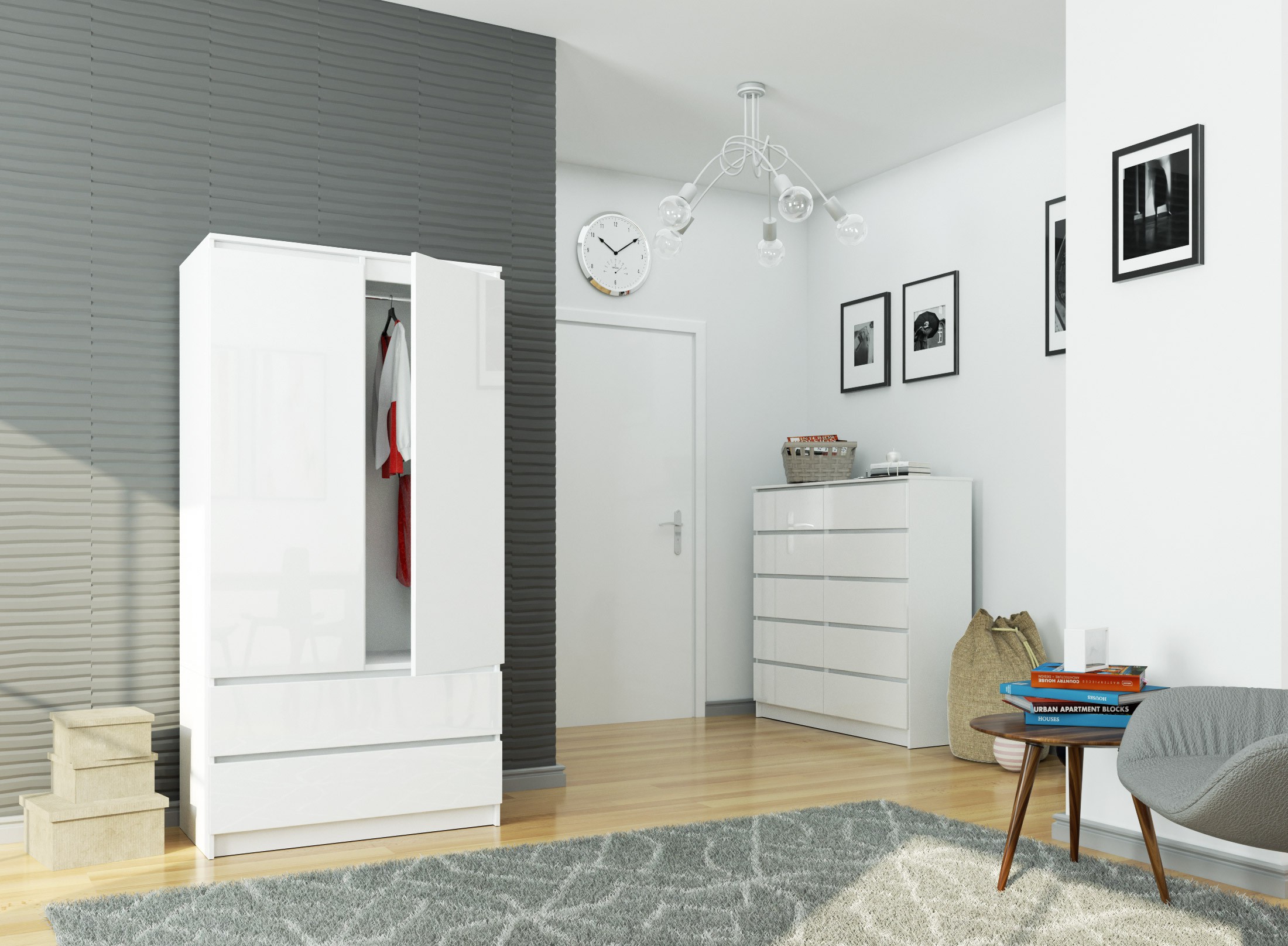 Bílá barva v kombinaci s lesklými plochami působí svěže, moderně a opticky projasňuje místnost. Skříň se tak snadno kombinuje s dalším nábytkem a hodí se do interiérů v moderním i minimalistickém stylu.