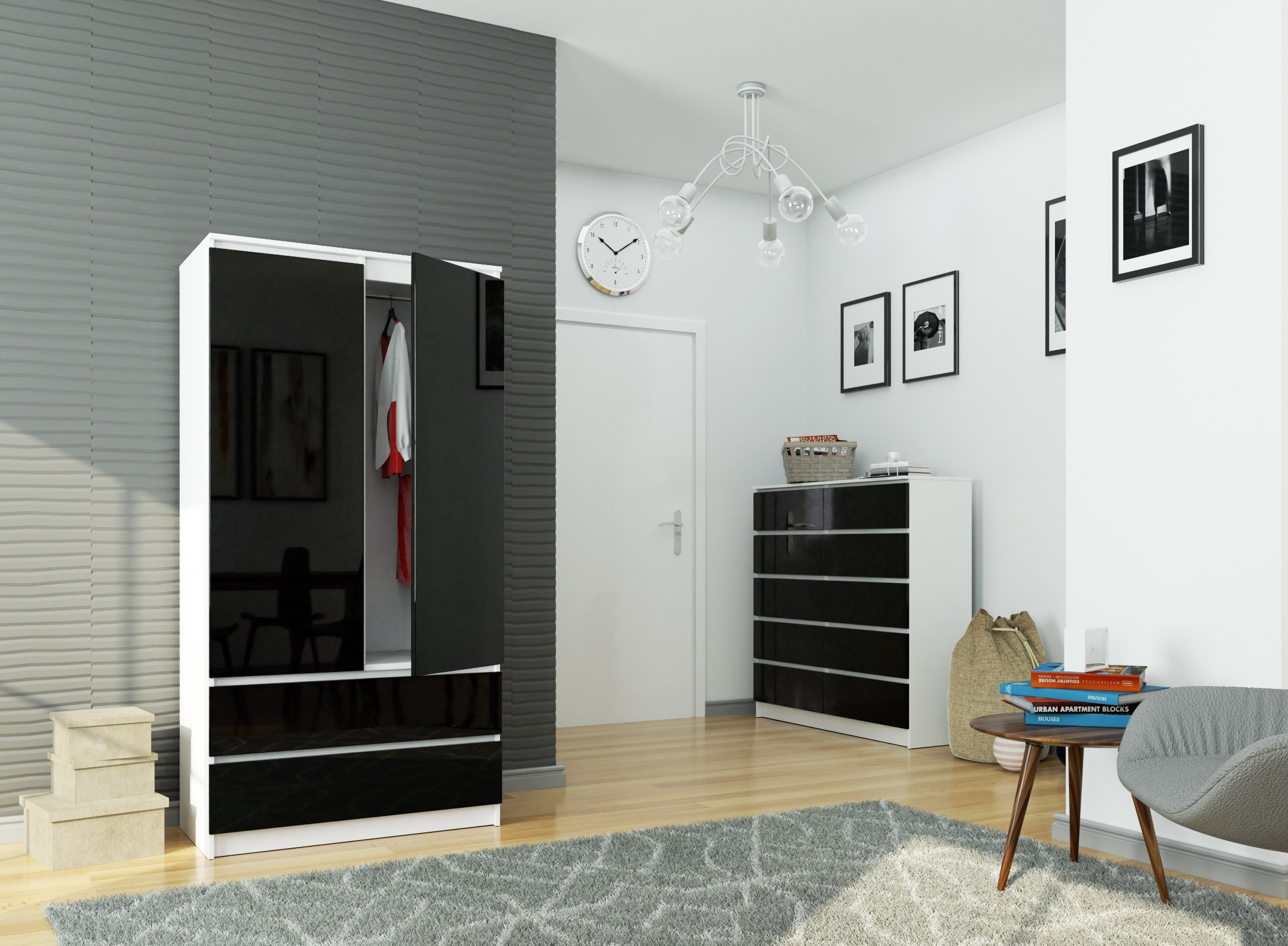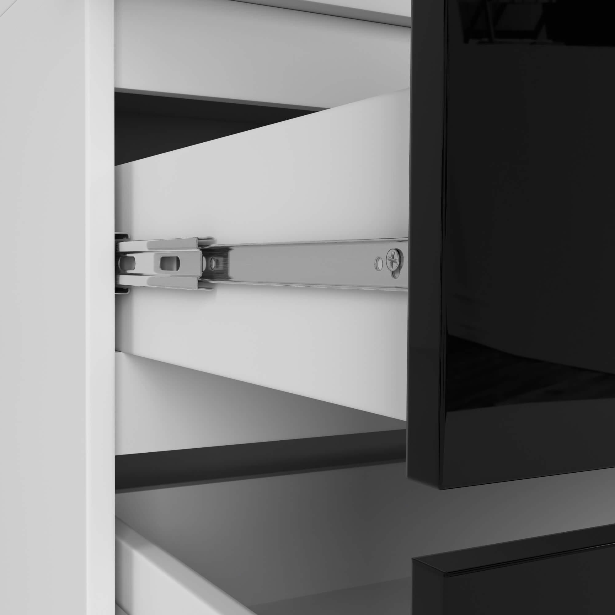 Šatní skříň S90 se dvěma dveřmi a dvěma zásuvkami spojuje originální design s vysokou praktičností. Kontrast bílého korpusu a černých čel ve vysokém lesku dodává nábytku moderní a elegantní vzhled, který skvěle zapadne do současných interiérů.