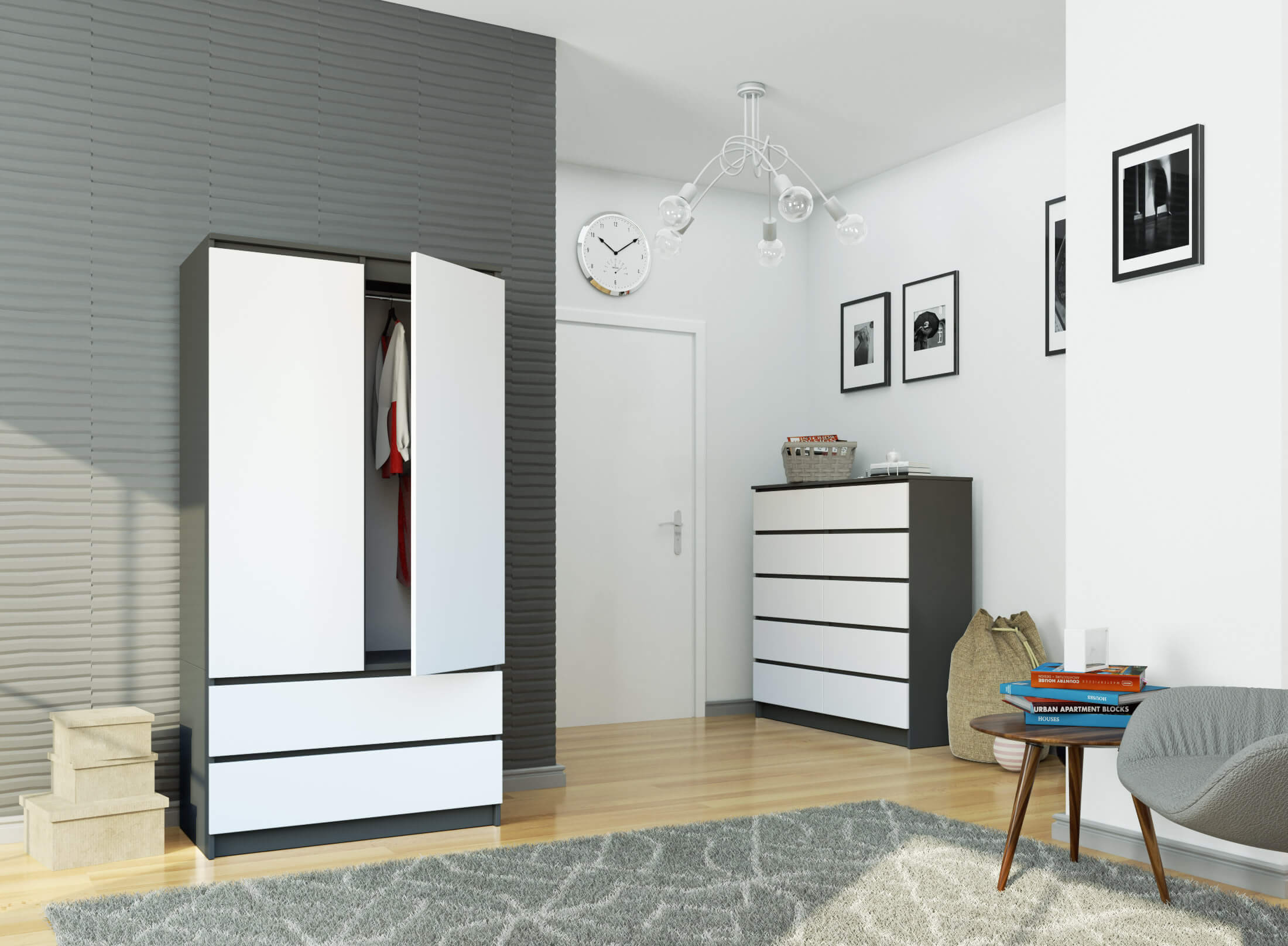 Šatní skříň S90 se dvěma dveřmi a dvěma zásuvkami v elegantní kombinaci grafitově šedé a bílé barvy je moderním a funkčním řešením pro ukládání oblečení i domácích doplňků. Díky svému nadčasovému dvoubarevnému provedení se skříň snadno začlení do moderních i klasických interiérů.