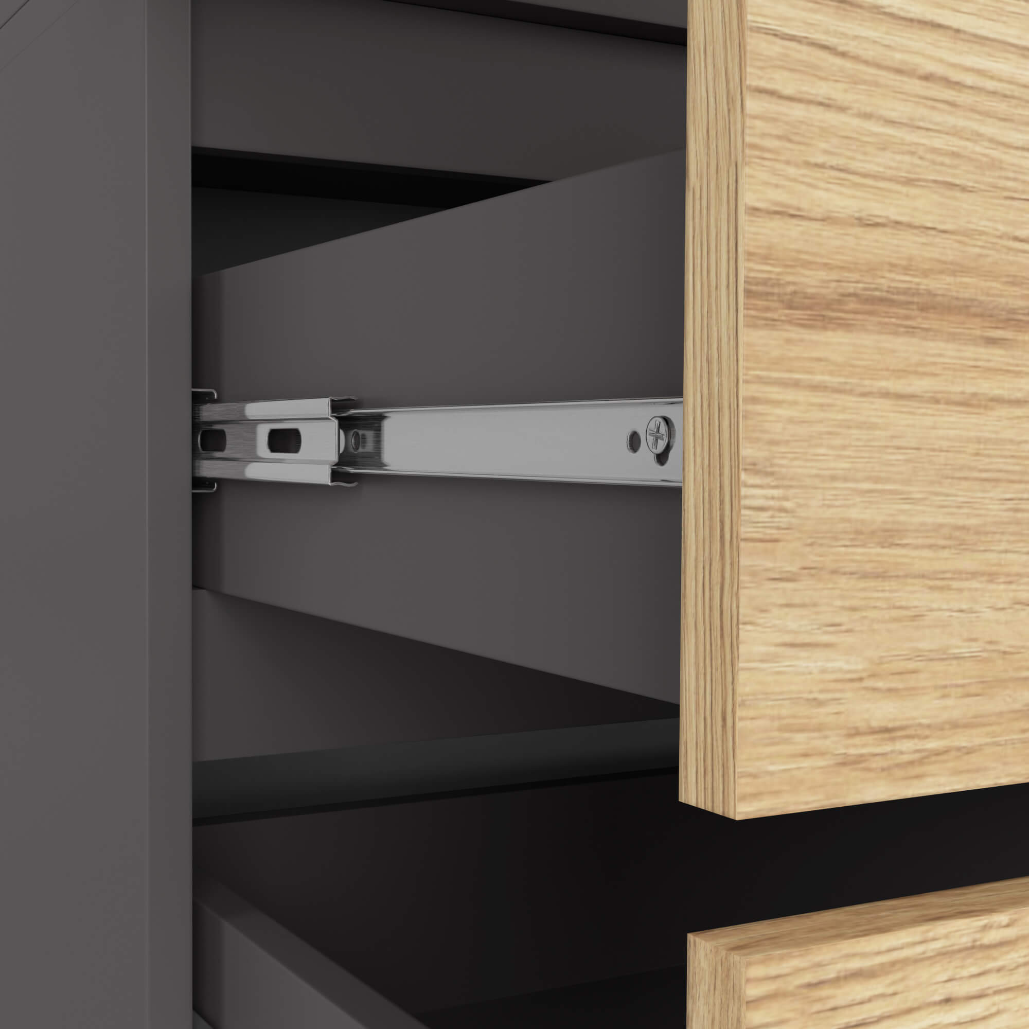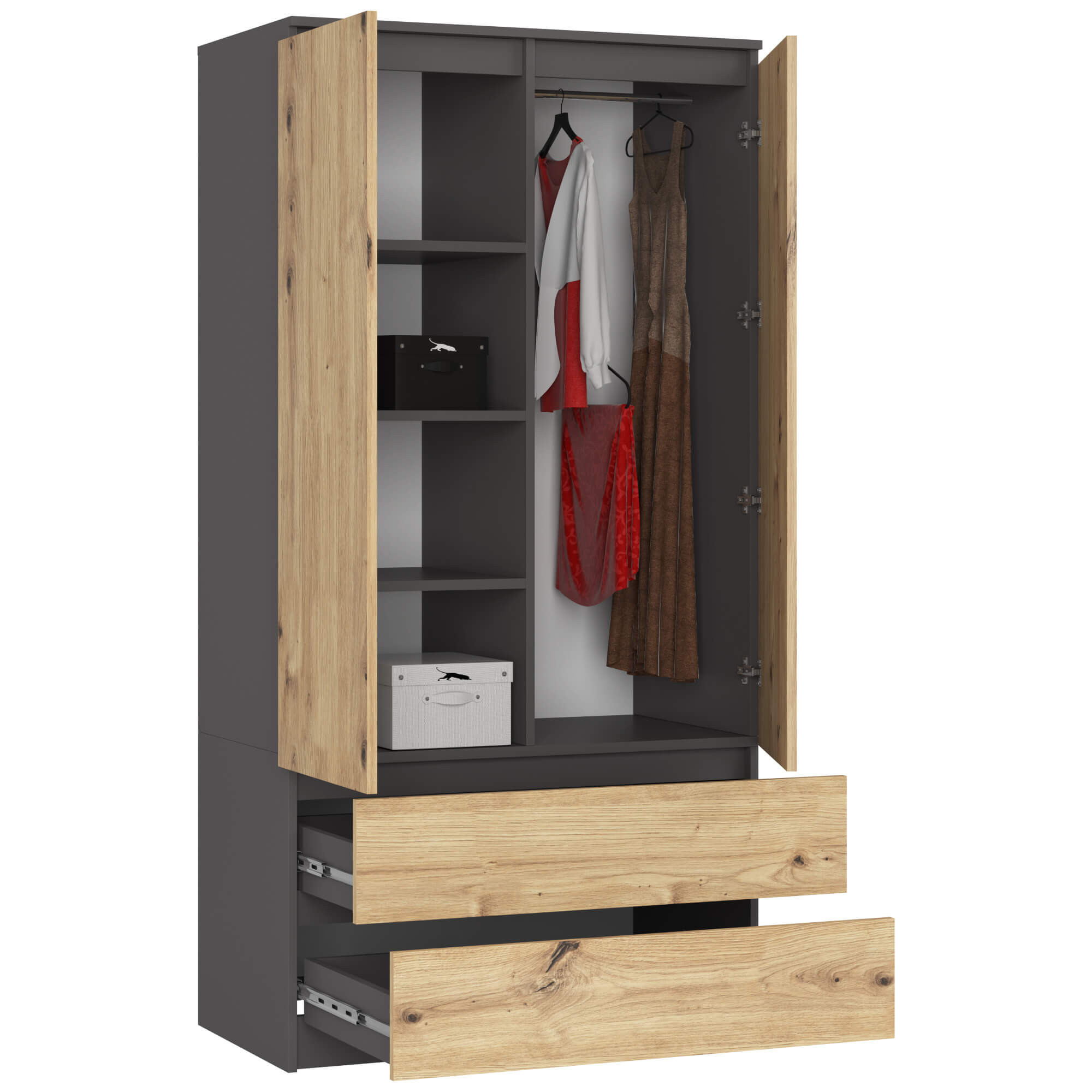 Šatní skříň S90 se dvěma dveřmi a dvěma zásuvkami v kombinaci grafitově šedé barvy a dekoru dub artisan představuje moderní a velmi funkční řešení pro ukládání oblečení i bytových doplňků. Díky svému elegantnímu dvoubarevnému provedení se snadno začlení do moderních i klasických interiérů.