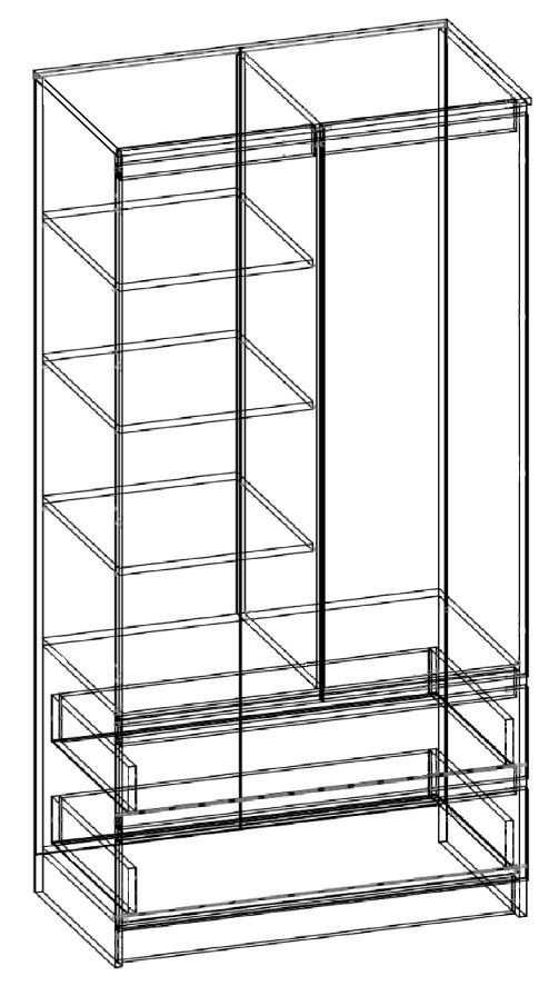 Vnitřní uspořádání skříně je navrženo s důrazem na funkčnost a přehlednost. Uvnitř se nachází praktická police a šatní tyč pro zavěšení oděvů, zatímco spodní část doplňují dvě zásuvky vhodné pro uložení prádla, doplňků nebo drobností.