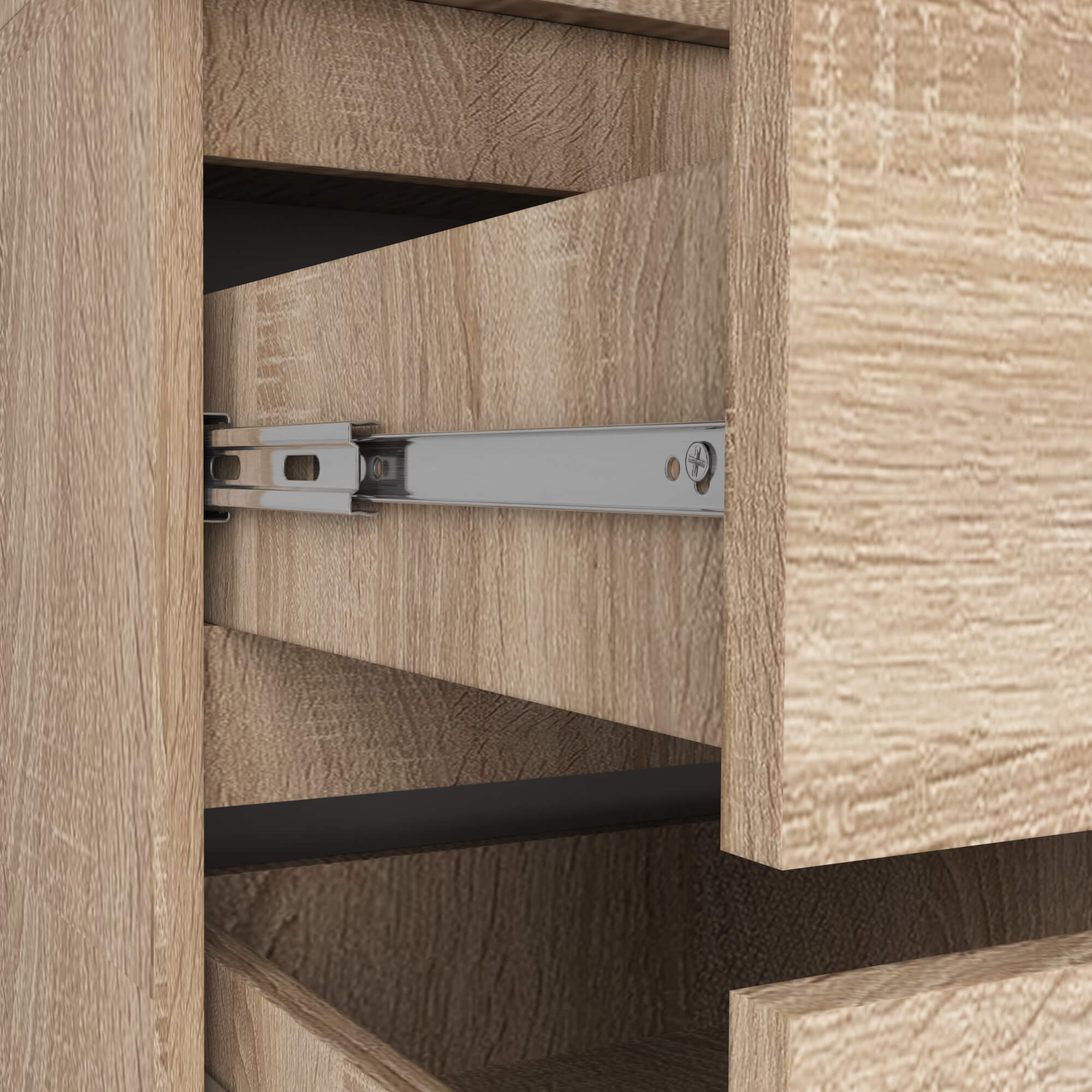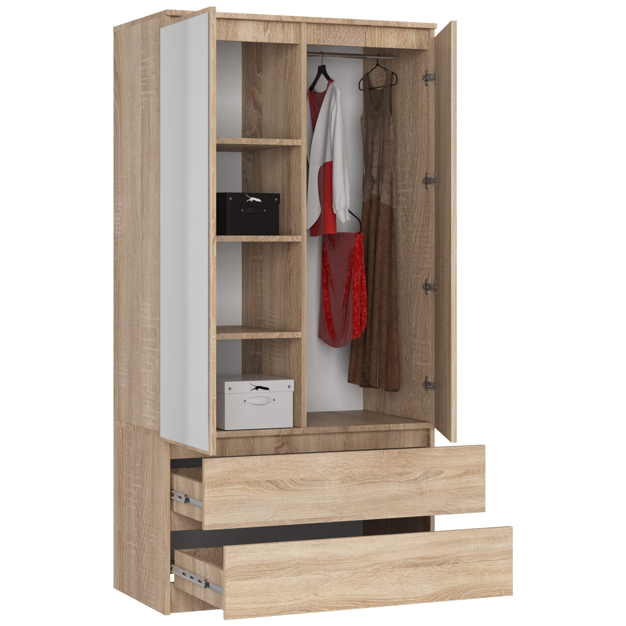 Vnitřní uspořádání je navrženo s důrazem na funkčnost. Skříň obsahuje polici a šatní tyč pro zavěšení oděvů, zatímco spodní část doplňují zásuvky pro uložení drobnějších věcí. Zásuvky jsou osazeny kvalitními kovovými kuličkovými pojezdy renomované značky GTV, které zajišťují plynulý a tichý chod.