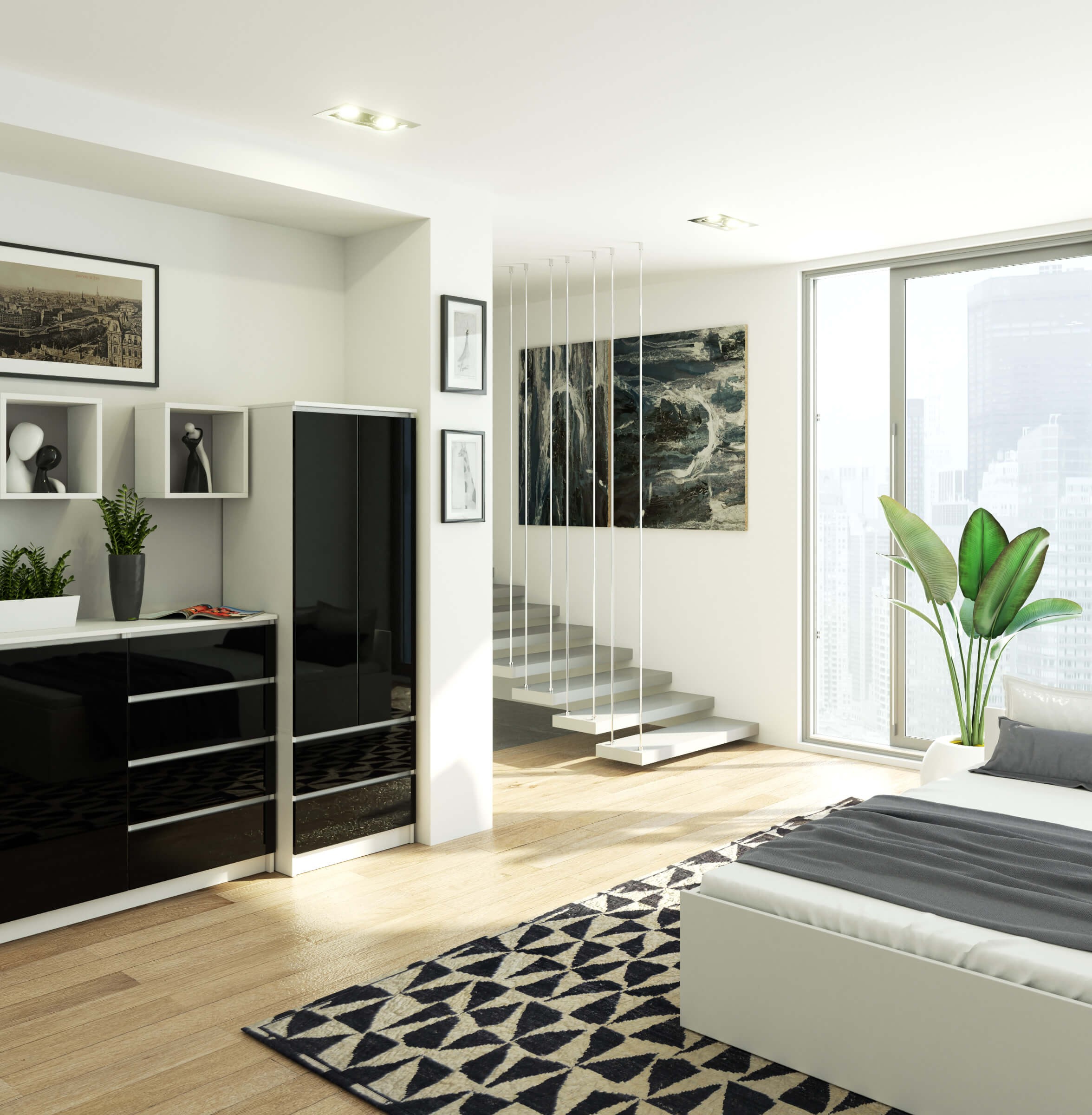 kontrastní moderní design: bílá konstrukce a černé lesklé čela