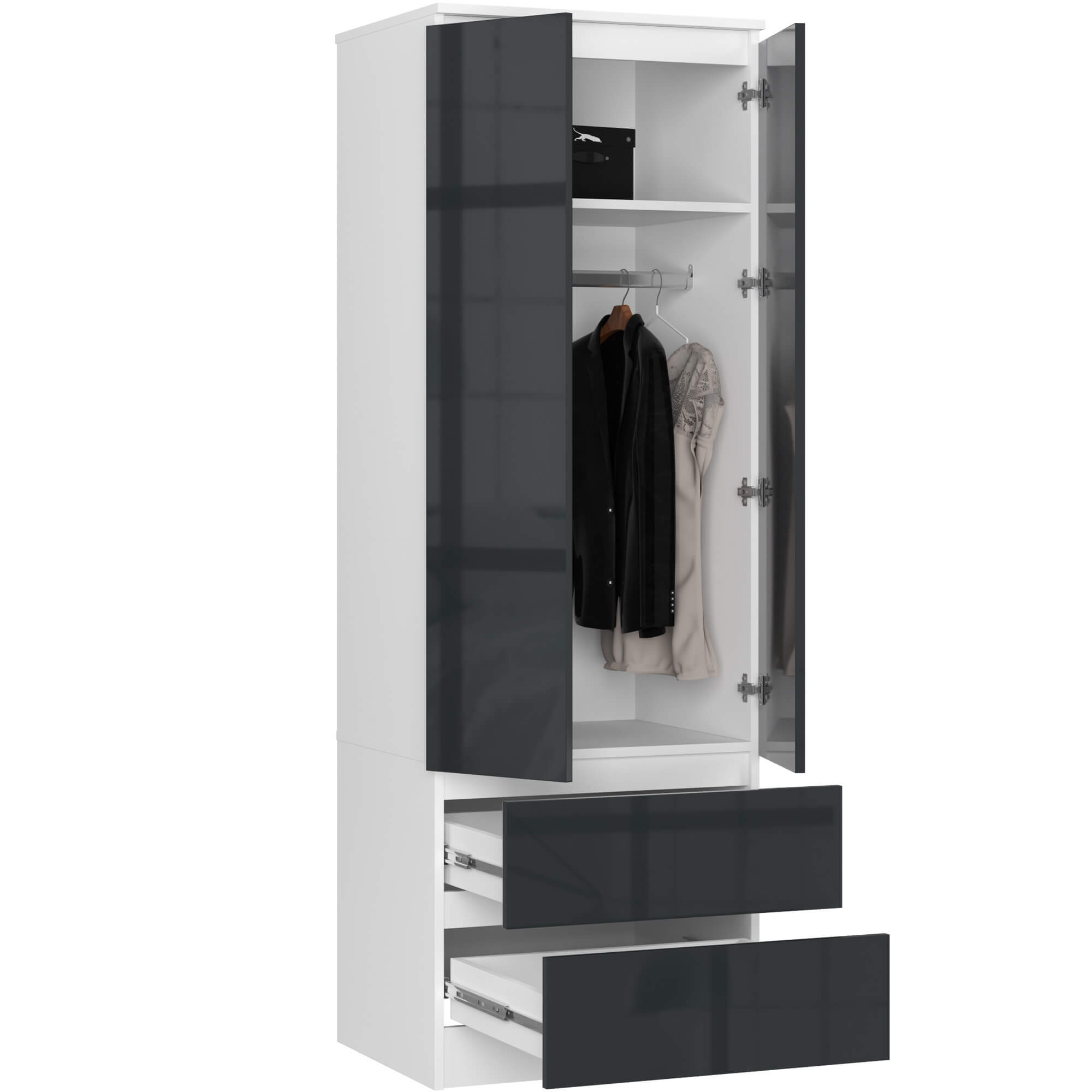 Šatní skříň Star S60 se dvěma dveřmi a dvěma zásuvkami je praktickým řešením pro domácnosti, kde je kladen důraz na funkčnost i moderní vzhled. Bílá konstrukce doplněná o čela v grafitovém vysokém lesku vytváří elegantní kontrast, který se skvěle hodí do moderně zařízené ložnice, předsíně nebo pokoje pro mladé.