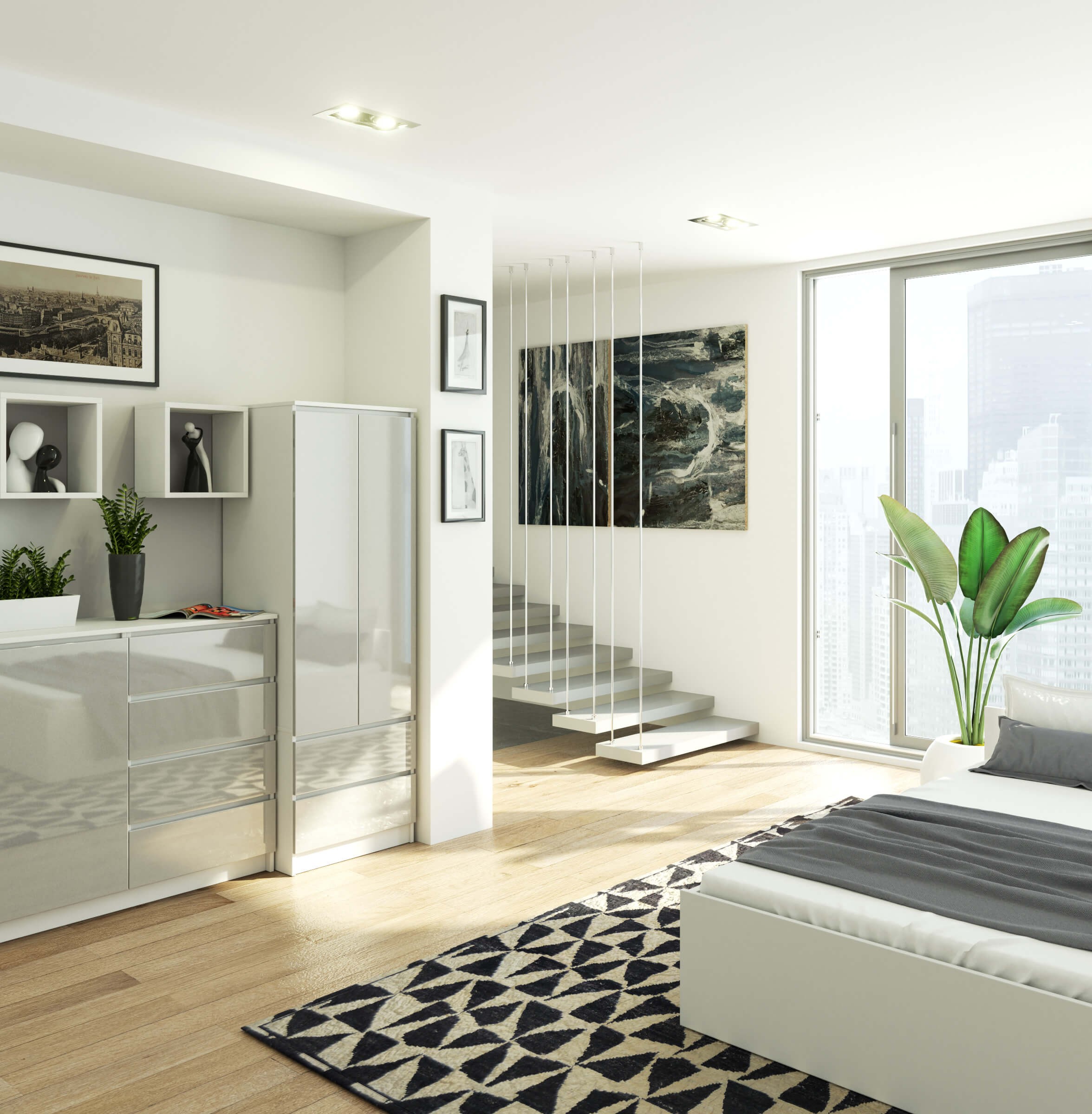 Zásuvky jsou osazeny kvalitními kovovými kuličkovými pojezdy renomované značky GTV, které zajišťují tichý, plynulý a dlouhodobě spolehlivý chod. Kombinace bílého korpusu a metalických lesklých frontů dodává skříni moderní a elegantní vzhled, který oživí každý interiér.
