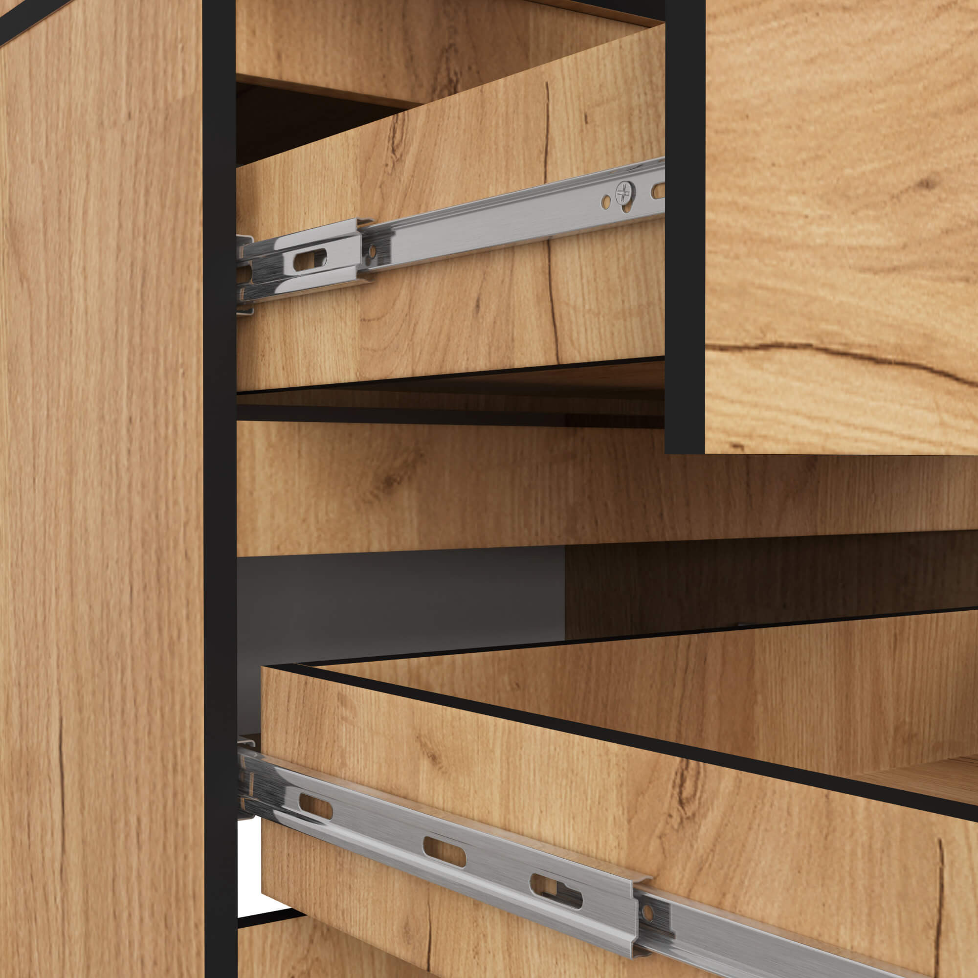 Konstrukce i čela zásuvek jsou vyrobeny z kvalitní laminované desky Kronospan o tloušťce 16 mm, která je odolná proti oděru a vhodná pro každodenní používání. Viditelné hrany jsou opatřeny ochranným ABS obrzežením, které zvyšuje odolnost nábytku proti mechanickému poškození a prodlužuje jeho životnost.