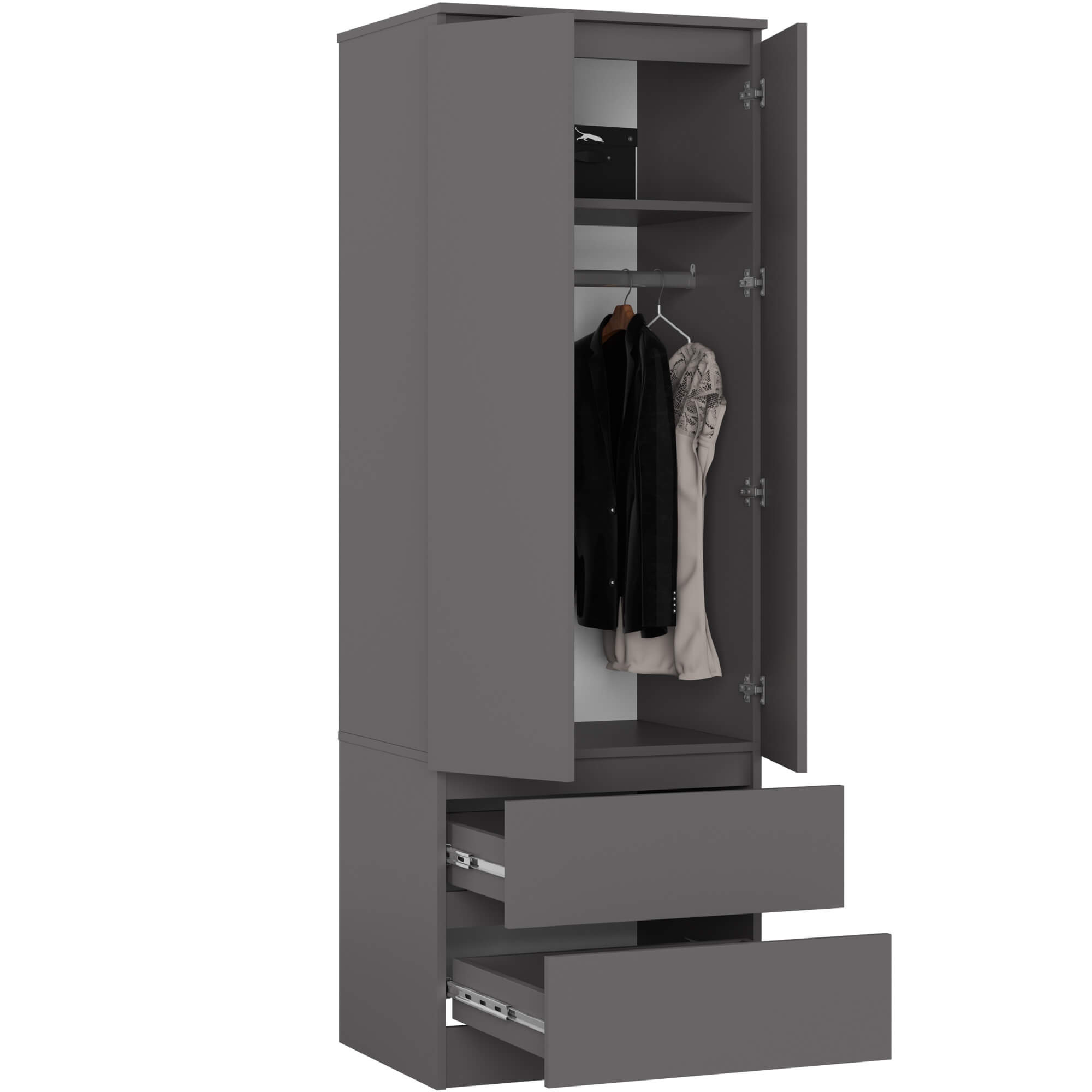 Vnitřní část skříně je vybavena policí a šatní tyčí, které umožňují přehledné zavěšení i uložení oblečení. Ve spodní části se nacházejí dvě zásuvky, vhodné pro spodní prádlo, doplňky nebo další drobnosti. Zásuvky jsou osazeny kvalitními kovovými kuličkovými pojezdy renomované značky GTV, které zajišťují plynulý, tichý a spolehlivý chod.